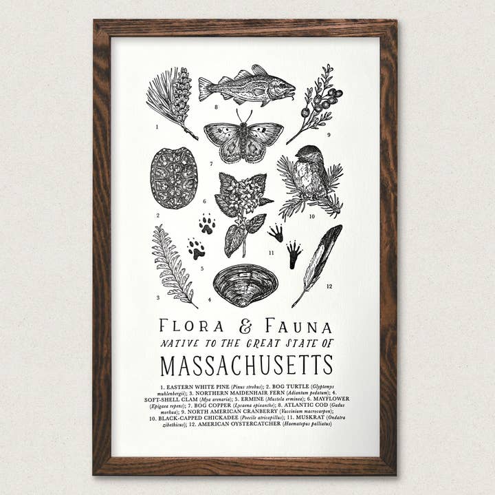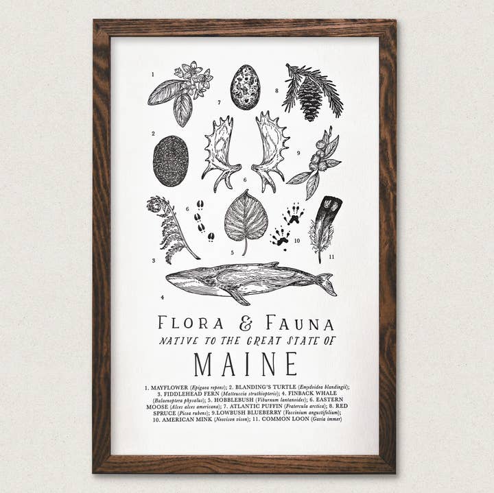 Una carta de tipografía ilustrada a mano que detalla la flora y fauna nativas del Gran Estado de Montana. Este gráfico muestra la vida silvestre, incluyendo pino Ponderosa, raíz amarga y oso pardo. DETALLES - Letterpress impresa en papel de algodón blanco suave de alta calidad - Tamaño 11x17 listo para enmarcar (marco no incluido) - Empaquetado en funda de celofán con respaldo de aglomerado de marca