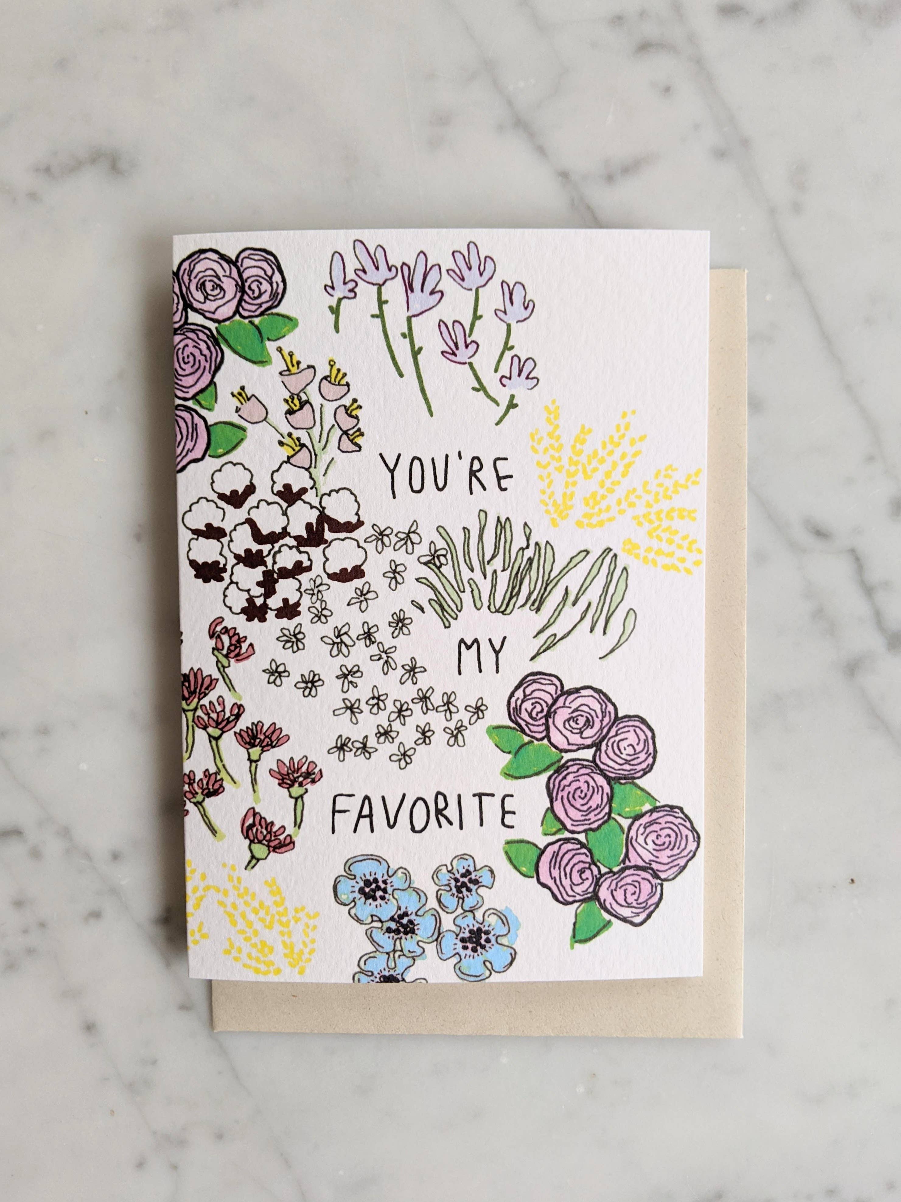 Tarjeta You're My Favorite (interior en blanco) en texto negro e ilustración floral multicolor Impreso en cartulina mate, texturizada, blanca brillante, de 350 g/m² El sobre de color natural está hecho completamente de residuos agrícolas Tamaño A6, 105 x 148 mm, 4.1 x 5.8 pulgadas Diseñada e impresa en los Países Bajos.