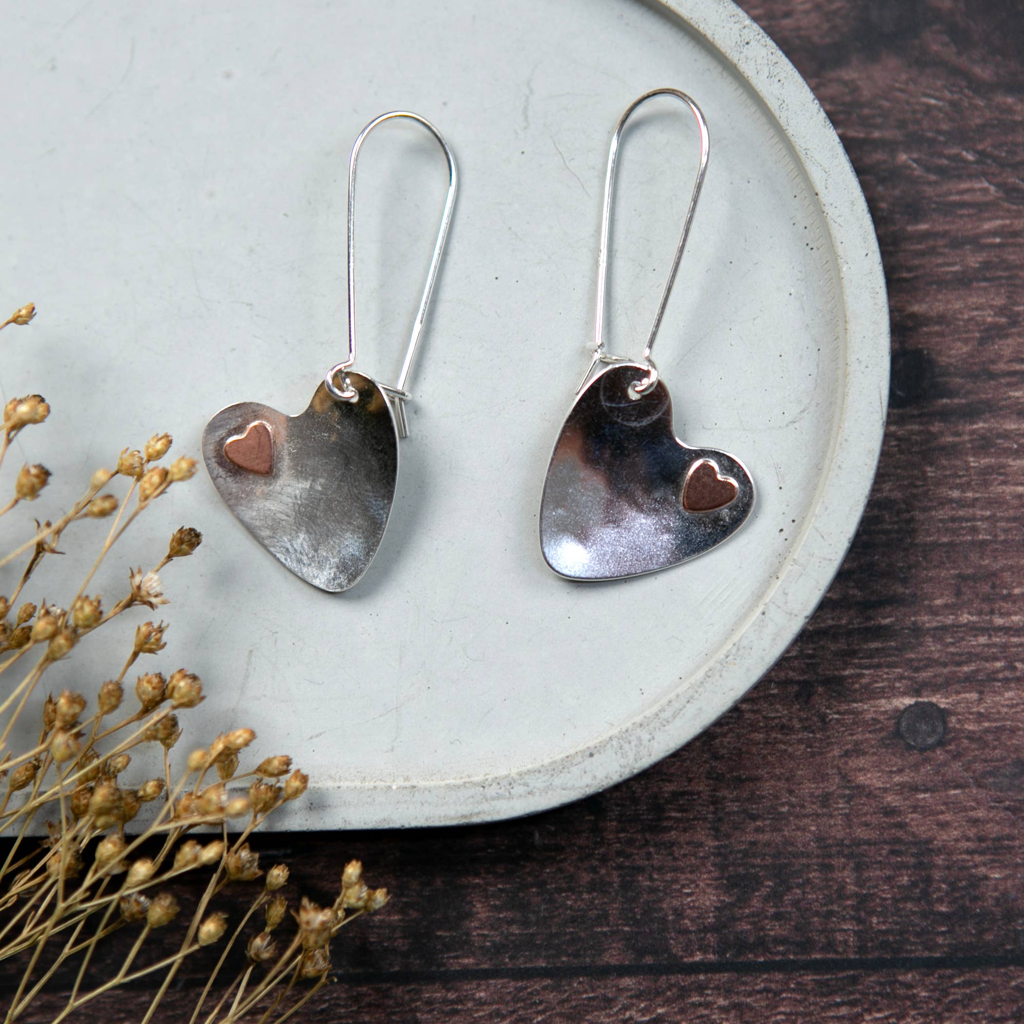 Plata de ley, forma de lágrima ligeramente martillada, con la opción de añadir un detalle de corazón o estrella en los ganchos para pendientes.