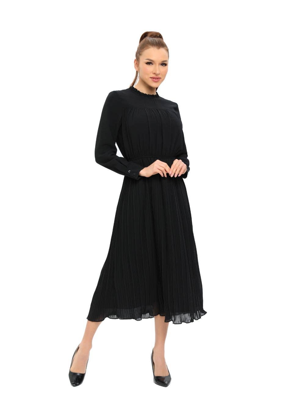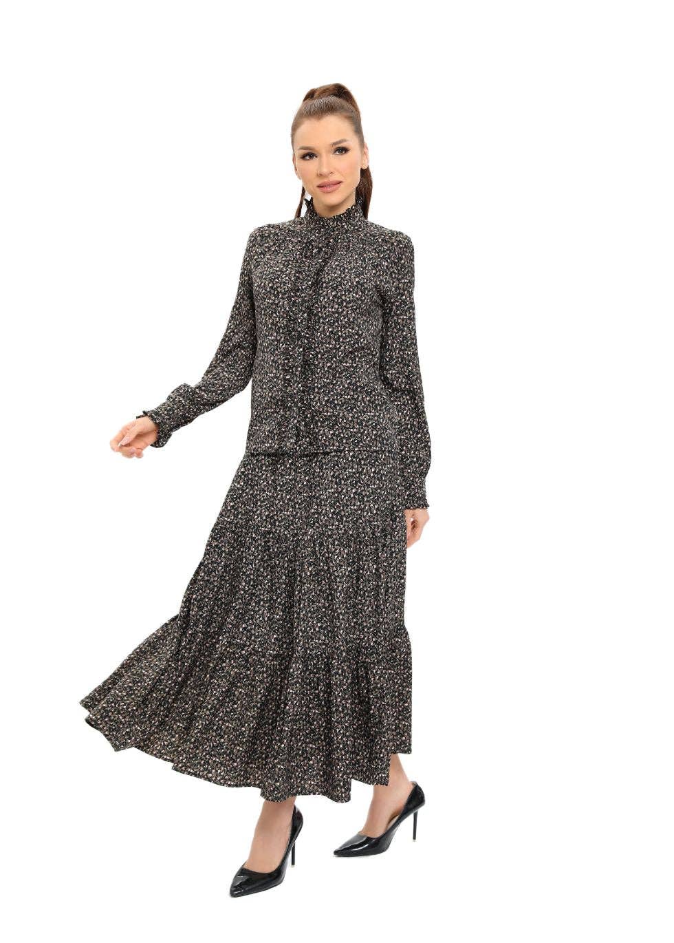 Este vestido midi negro con falda escalonada con forma de orquídea combina la elegancia con un diseño contemporáneo. Adornada con un distintivo estampado negro, aporta un toque sofisticado a la atemporal silueta midi. La falda escalonada del vestido es a la vez elegante y divertida, perfecta para diversas ocasiones, desde reuniones formales hasta salidas informales. Su diseño de manga larga, complementado con elegantes puños, añade un toque refinado. El largo midi es modesto pero a la moda, y cubre las rodillas para un uso versátil. Para mayor comodidad y discreción, está totalmente forrado. Disponible en tallas XS a XL, se adapta a una variedad de tipos de cuerpo, lo que garantiza un ajuste perfecto para cualquier persona. Esta pieza es la elección ideal para quienes buscan una modestia elegante en su armario.