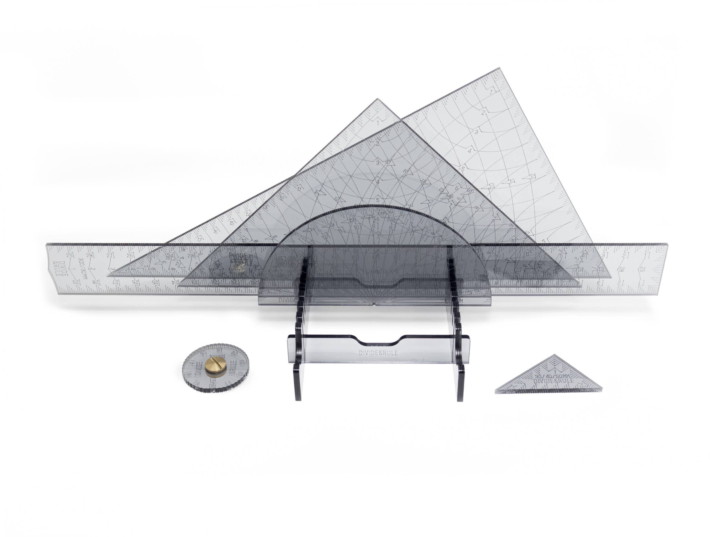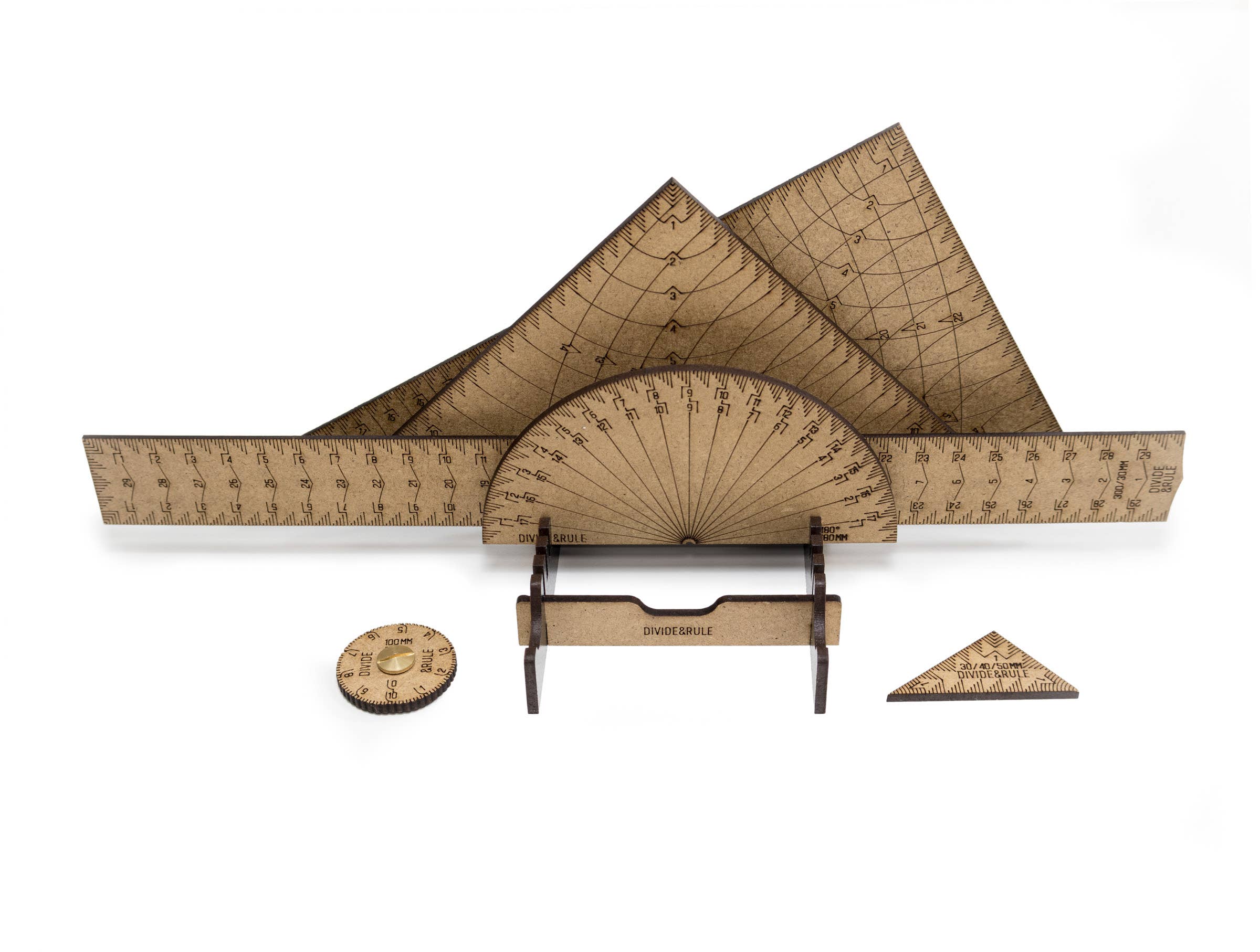 El soporte de exhibición de 7 artículos es una forma sencilla de mantener todas tus reglas, transportadores y escuadras al alcance de la mano. Un diseño de ensamblaje simple sin herramientas. El soporte de exhibición de 7 artículos puede sostener cualquier combinación de nuestras reglas, transportadores y la escuadra 30/60/90° y la escuadra 45/45/90°. Parte de la Colección Original. Un conjunto cálido y táctil de productos fabricados en el Reino Unido con MDF europeo reciclable y neutro en carbono que proporciona un hermoso aspecto texturizado a la superficie. Todas las marcas están grabadas para asegurar que no se desgasten con el tiempo y la parte posterior está pintada de negro para permitir que las piezas se deslicen suavemente sobre cuadernos y papel de dibujo. 87 x 82 x 26 mm (cuando está ensamblado)