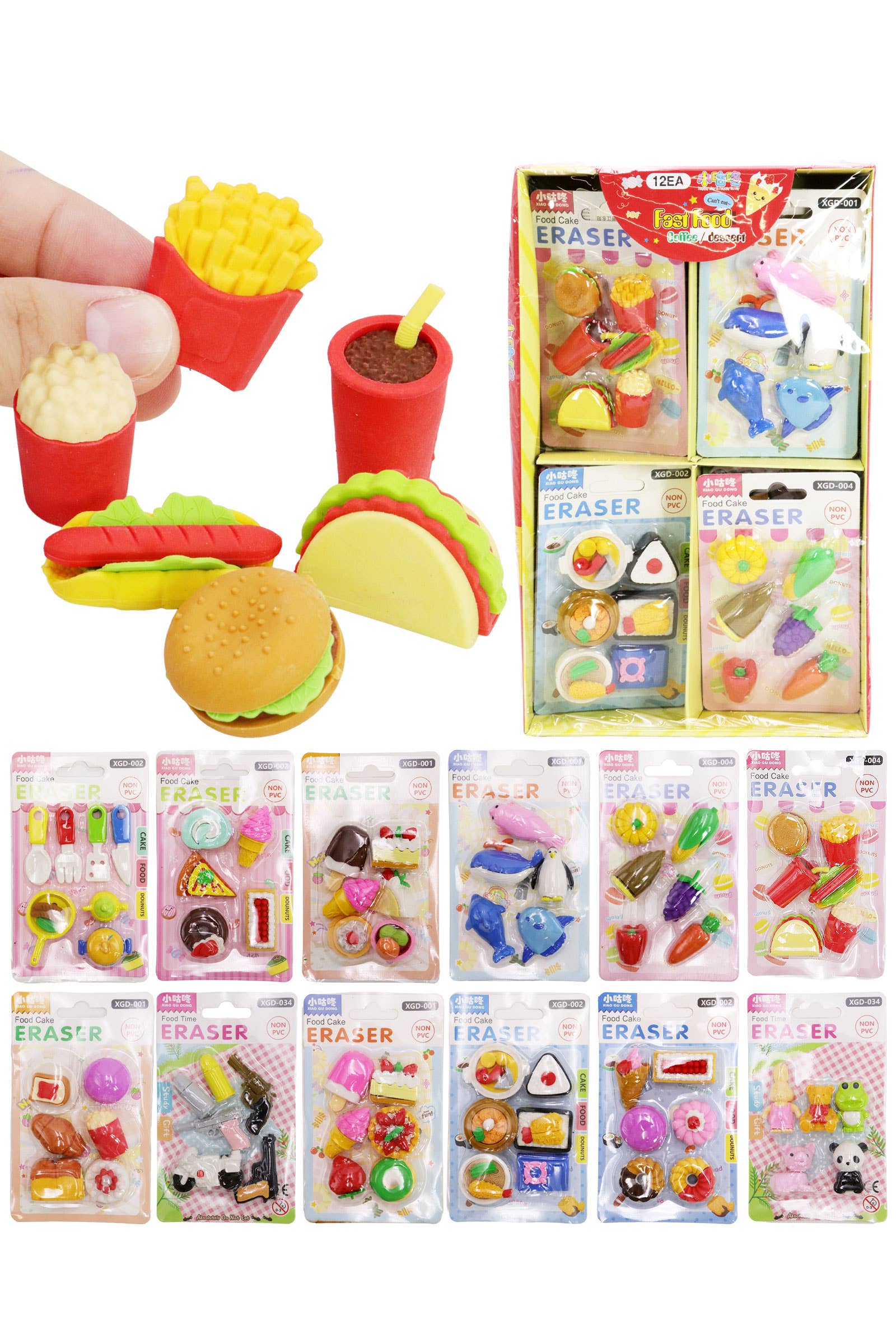 Colección de borradores de TPU para papelería Airplane Novelty -Diseño variado (12 - 6 unidades por diseño) -Dimensiones del borrador: 2 x 1 x 1 pulgada. -Dimensiones de la tarjeta: 5.75 x 3.75 x 0.75 pulgadas (empaquetadas individualmente). -Dimensiones de la caja de presentación: 12 x 8 x 3 pulgadas (sellada en su totalidad) -100% TPU -Asesoramiento sobre la Proposición 65 de CA