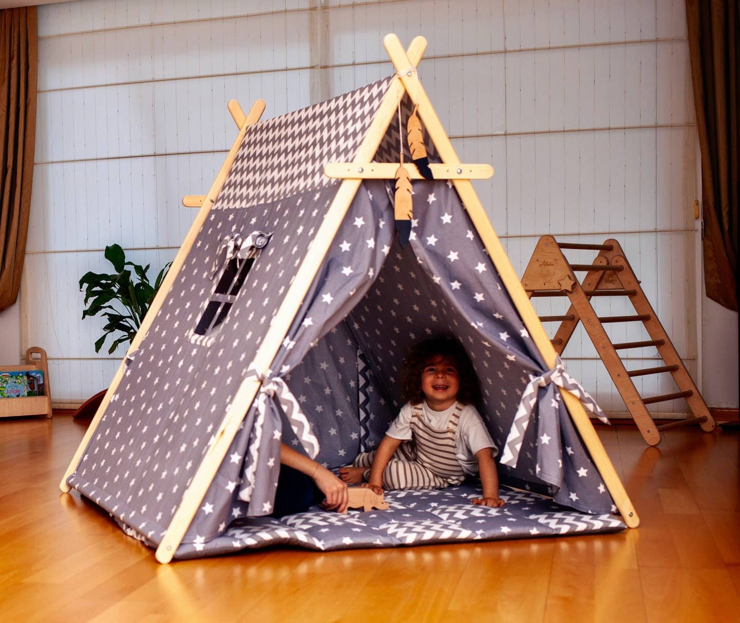 Set de tienda tipi interior tamaño XL de 2 piezas (tienda para niños + alfombra de juego). Esta tienda tipi para niños está hecha con madera de pino natural de la más alta calidad y tela 100 % natural de mezcla lino-algodón. Nuestra tienda de juego gris es perfecta para que los niños jueguen dentro, se relajen, duerman y descansen. La alfombra de juego está confeccionada con tela premium de mezcla lino-algodón y rellena con fibra de poliéster hipoalergénica. Diversión garantizada con emoción, risas y sonrisas en cada uso, ¡y lo mejor de todo, manos libres para jugar! Nuestro tipi es ligero y fácil de transportar de un lugar a otro, además de ser resistente y muy duradero.