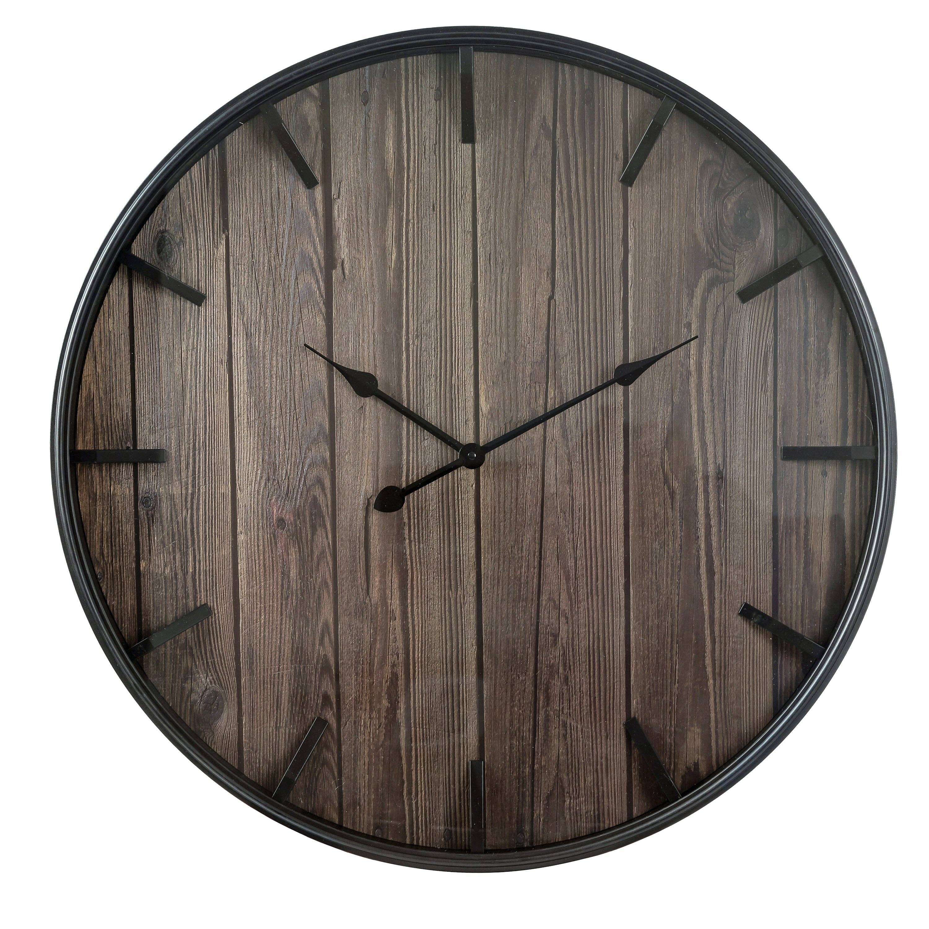 Reloj redondo de pared de madera con números romanos en acabado negro envejecido. Dimensiones del producto: 32 pulgadas de diámetro x 1.5 pulgadas de profundidad
