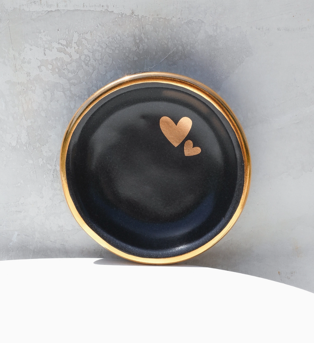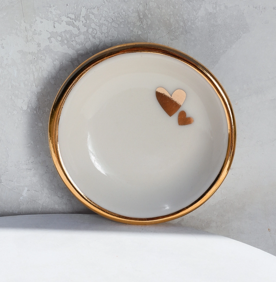 Plato circular con forma de corazón doble | Cerámica hecha a mano con oro