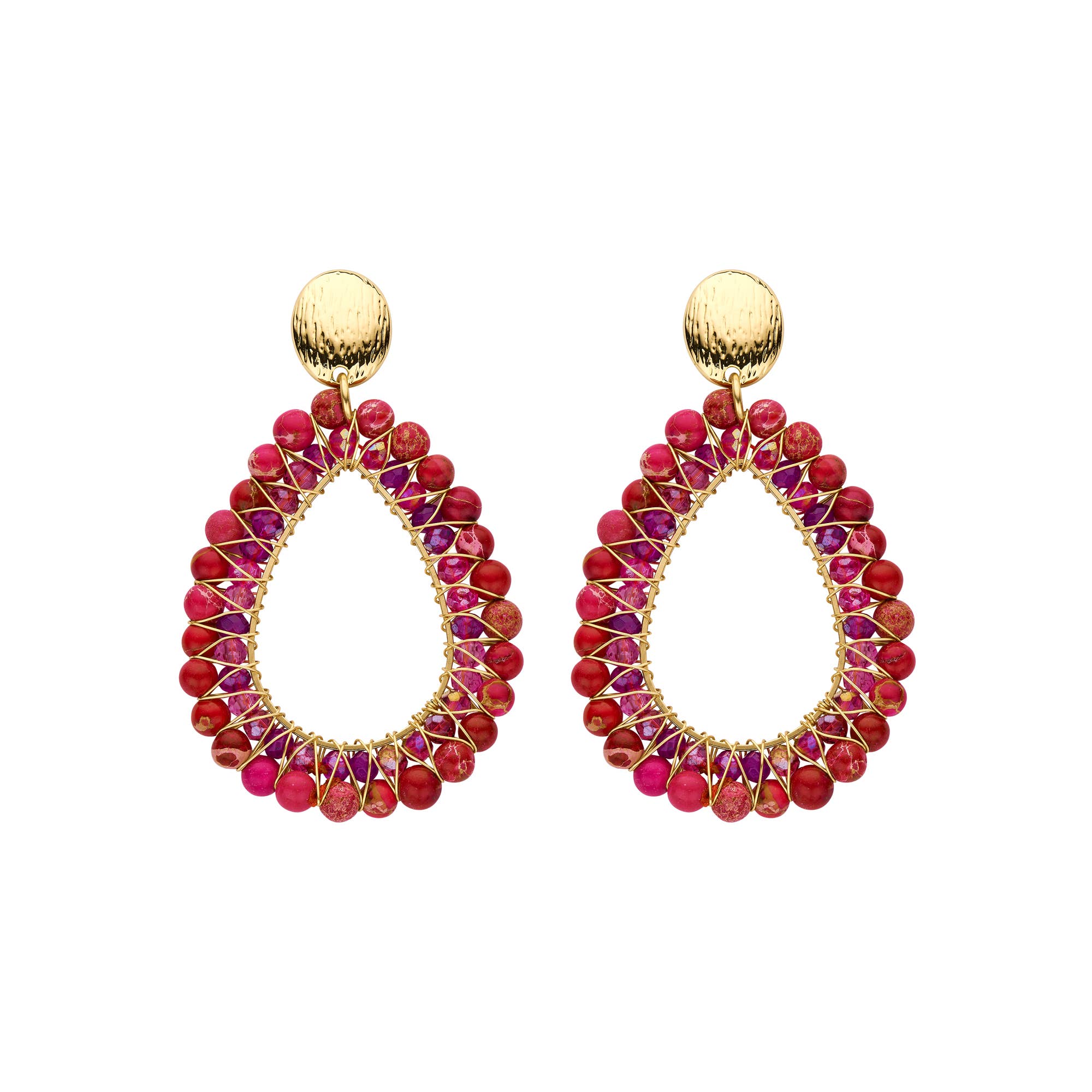 Hermosos pendientes colgantes hechos de acero inoxidable con una capa de oro de 14k. Los pendientes contienen varios colgantes y dijes hermosos de acero inoxidable, vidrio y cerámica. Los pendientes son fáciles de llevar y no son pesados en la oreja.