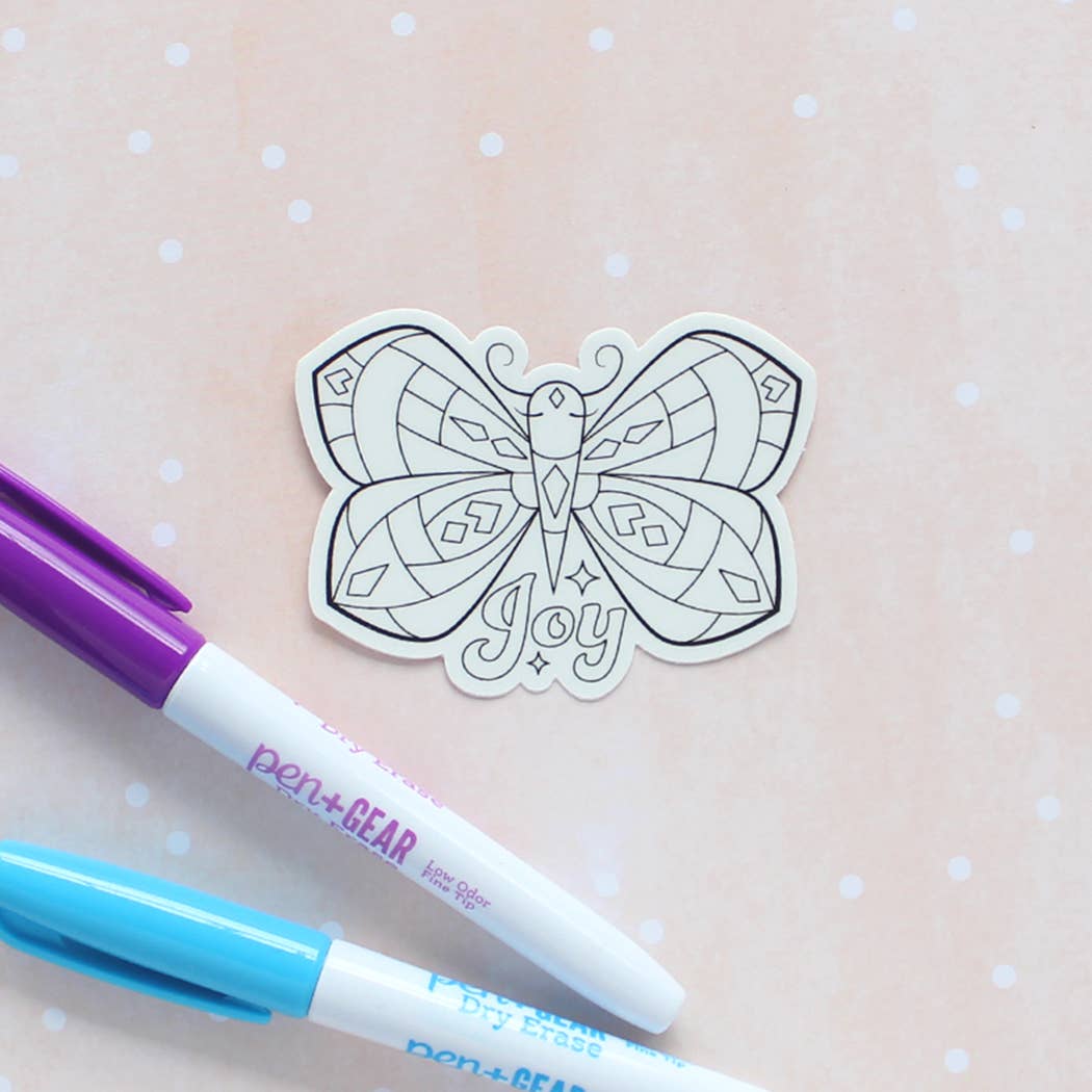 El kit de vinilo para colorear viene con dos marcadores de borrado en seco. ¡Colorear, limpiar, colorear de nuevo! Dos marcadores de borrado en seco incluidos. Los colores pueden variar. La pegatina mide aproximadamente 7,6 x 7,6 cm.