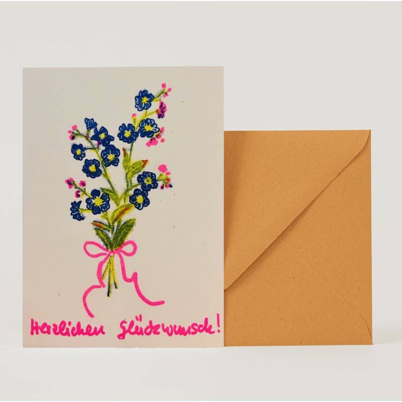Tarjeta plegable con sobre de papel kraft C6 y funda protectora de celofán biodegradable sin plástico. Impresa con tintas a base de soja y salvado de arroz en papel reciclado. Impreso con Risograph.