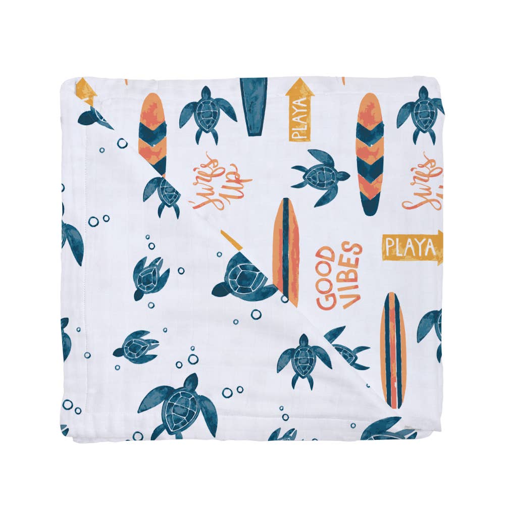 Estas tortugas han migrado a través de un océano entero para anidar junto a tu pequeño. Coordina con nuestra nueva impresión 'Surf'. Colores destacados: azulado de aguas profundas.