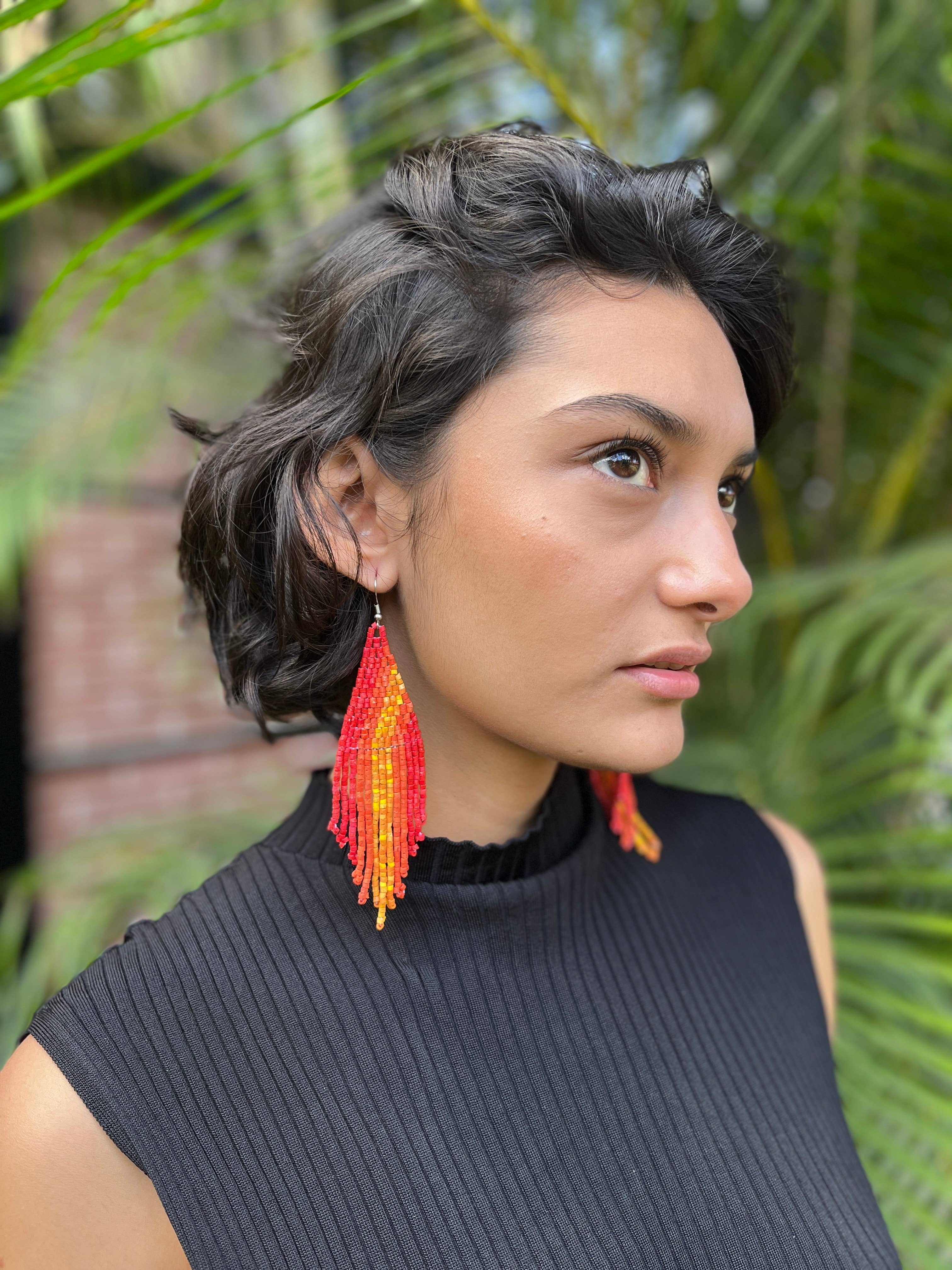 Hechos a mano éticamente por artesanos mayas en Guatemala (vea la foto de una artesana que los hizo a mano). Cada cuenta de arcilla está hecha a mano con una técnica precolombina de los pueblos indígenas de Colombia. Nuestra familia colombiana lo trajo a Guatemala para trabajar con talentosos artesanos mayas. Esta colección tiene la versión pequeña de nuestro tamaño estándar de cuentas, lo que significa que son MUY ligeras (0,28 oz, 8 g). Honestamente, es como no llevar nada y, sin embargo, llevar un par de pendientes colgantes, llamativos y con flecos en colores y formas mágicas. Vienen en varios diseños y colores, pero todos tienen la misma forma similar a la de las pirámides de Tikal. Este diseño específico de Tikal tiene un diseño hermoso y asimétrico. Los dos pendientes están reflejados enmarcando el rostro de forma hermosa. Cada par viene con una tarjeta informativa de pendientes con nuestra historia e instrucciones de cuidado en la parte posterior. Consulte las imágenes. Material Perlas: Ceramic Beads™, teñidas (acrílicas) Gancho: gancho hipoalergénico Peso: 8 g//0.28 oz