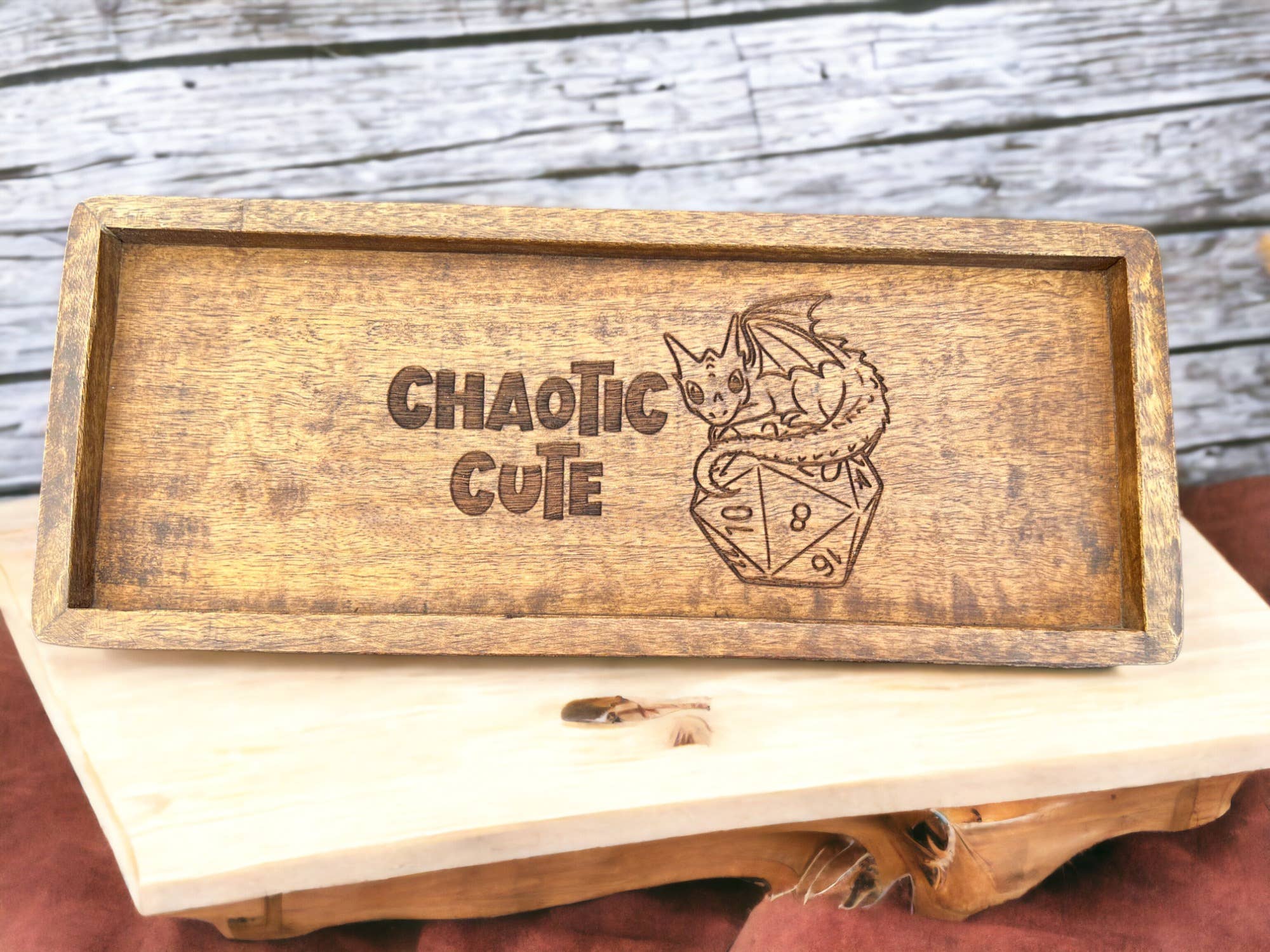 Esta bandeja es ideal para juegos, llaves, joyas o cualquier otra cosa que quieras guardar en ella. Hecho de madera de mango y mide 12 x 5 x 75 pulgadas. El diseño está grabado en la madera.