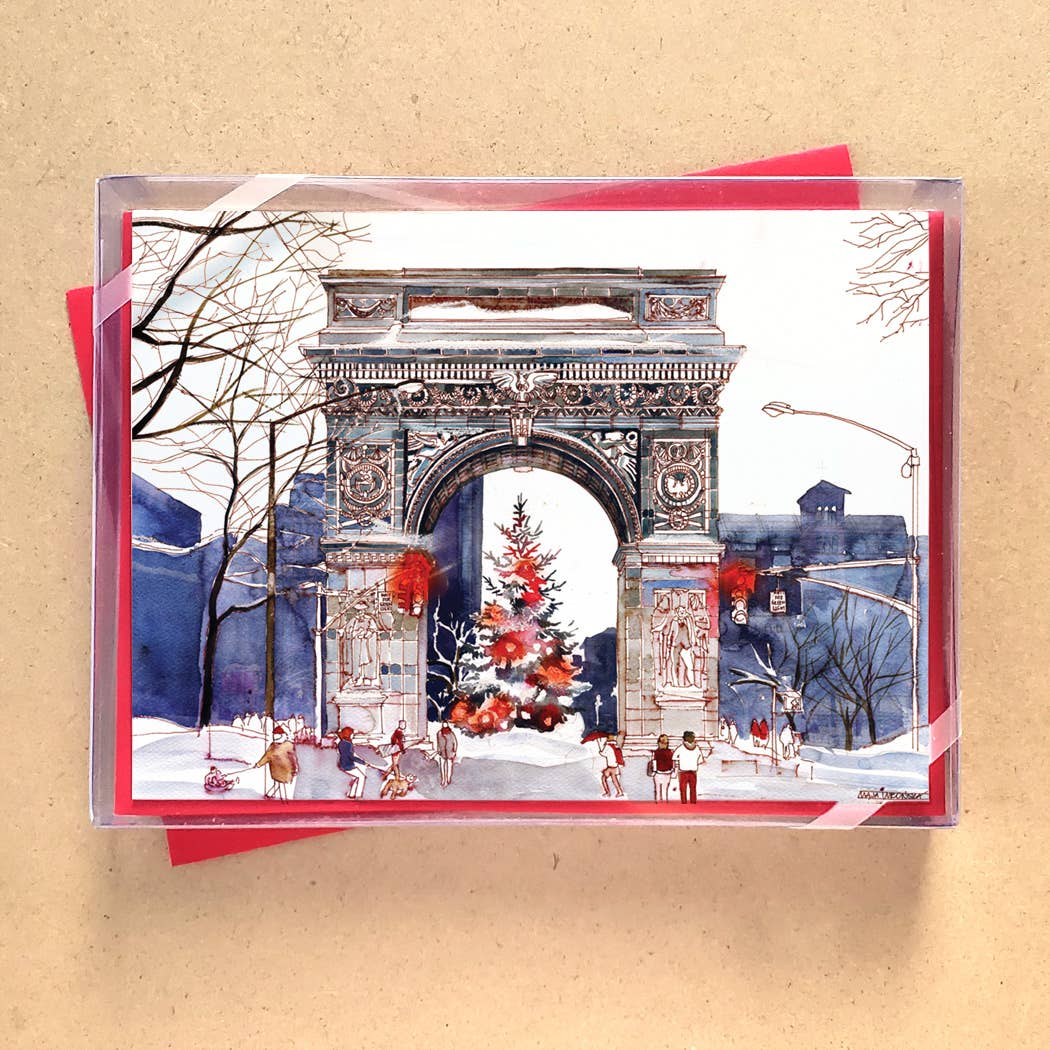 Saludo interno: ¡Te deseo una feliz temporada! Detalles: acabado blanco mate de 4 1/2 x 6 pulgadas, impreso en cartulina gruesa. Caja de 10 Diseñado por la artista Patti Gay. ¡Fabricado de forma sostenible en los EE. UU.!