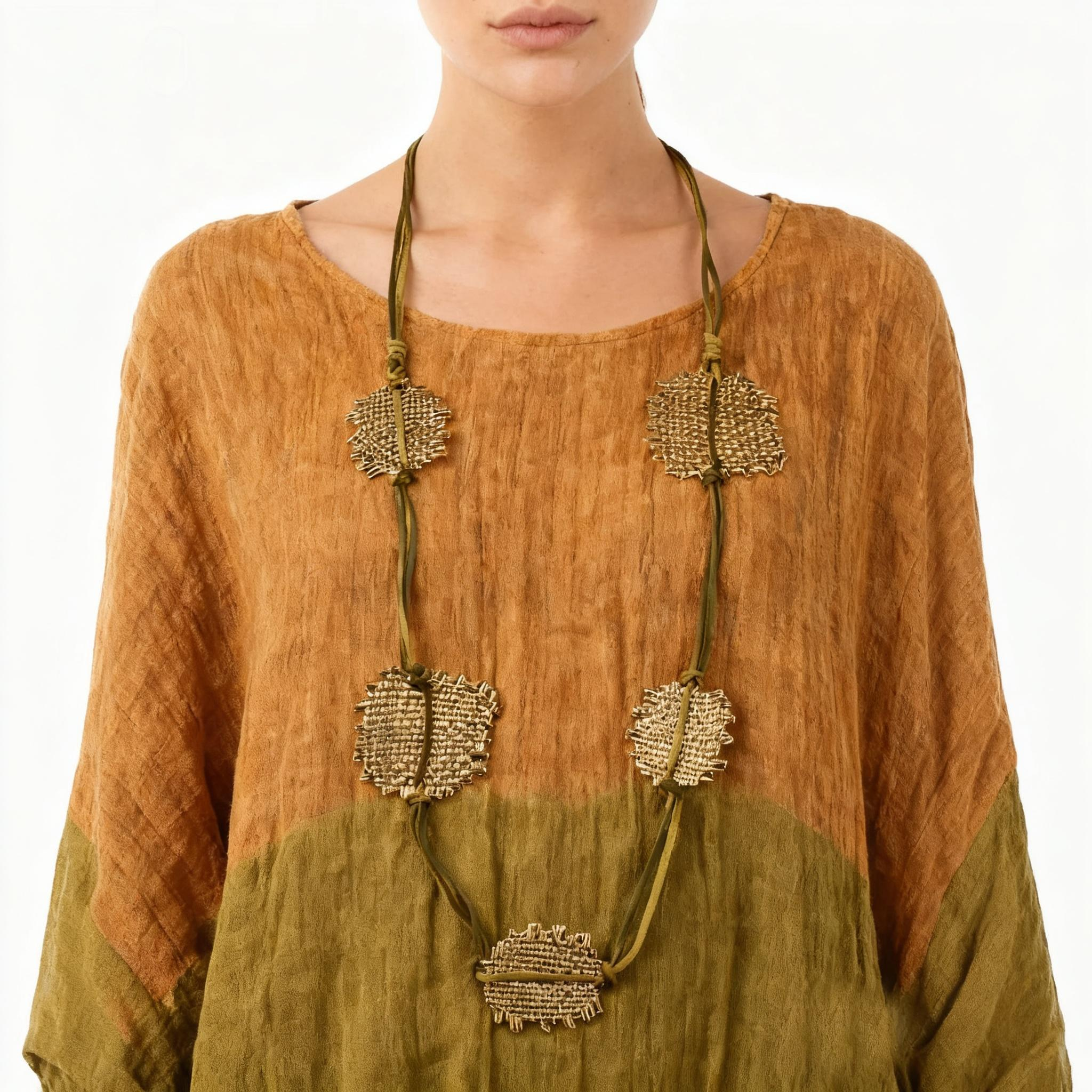 El collar de plumaje tiene 9 dobladillos a mano y plumas de tela de alambre corrugado en bucle en una banda de punto vikingo. 3,5 pulgadas desde la parte superior de la banda hasta la parte inferior de las plumas, descansa debajo del hueso del cuello. Se añade una cadena de ajuste de 7,62 cm para mayor flexibilidad. Materiales: placa de plata sobre latón con tonos pintados a mano de celadón metálico suave y acabado lacado en oro. Limpiar con un paño húmedo, por favor aplique perfume o laca para el cabello antes de poner sus joyas.
