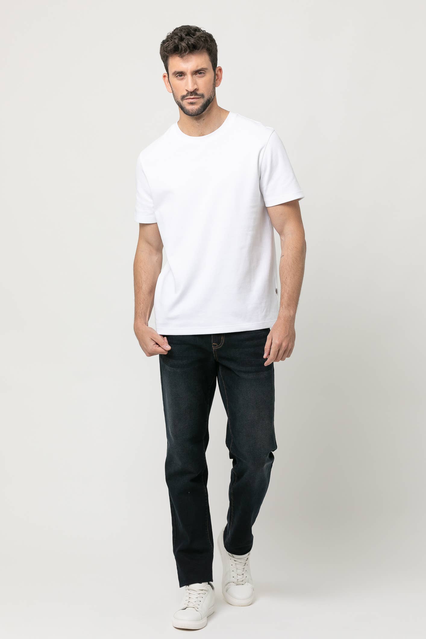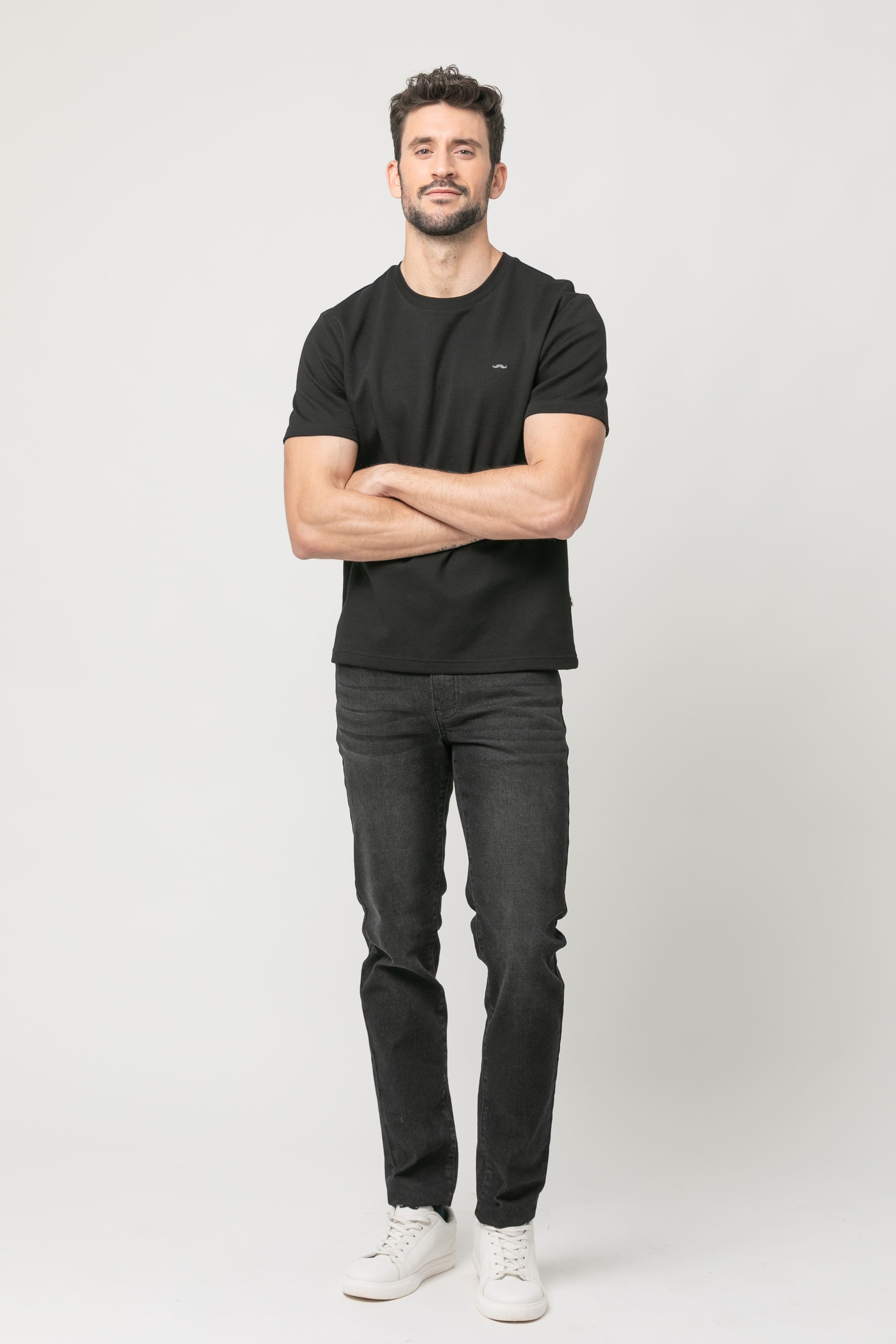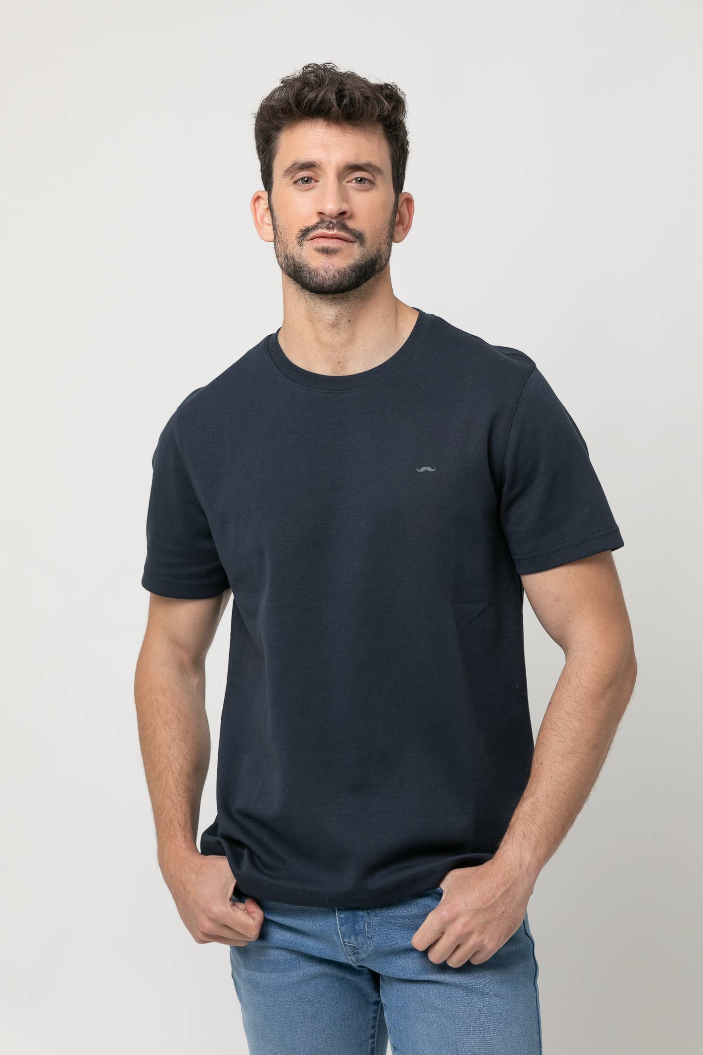 Camiseta básica de manga corta confeccionada en algodón de alta calidad para máximo confort y suavidad. Diseño liso con cuello redondo y bajo recto. Logo de nuestro icónico bigote bordado en el pecho. Perfecta como fondo de armario o para looks relajados y modernos.