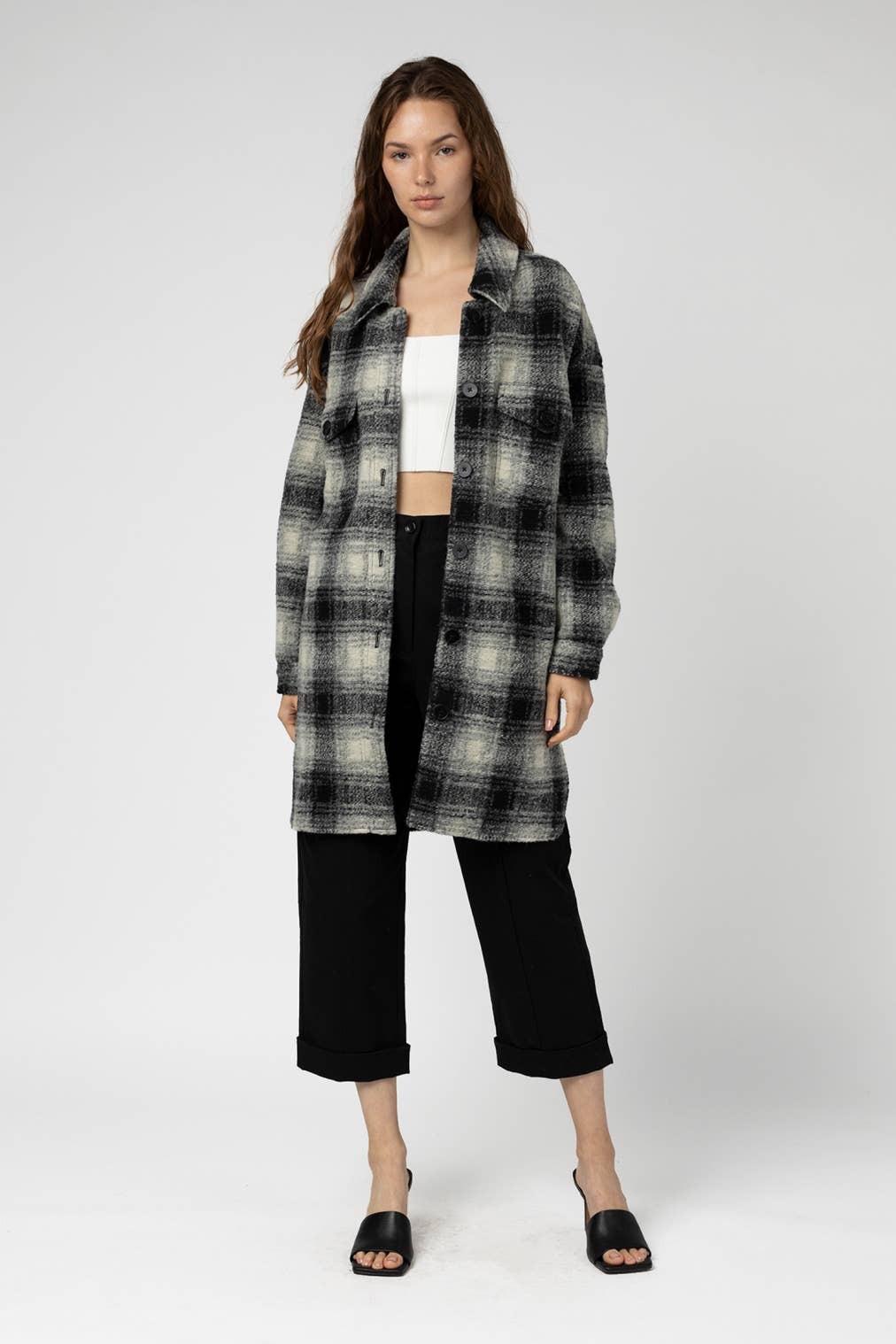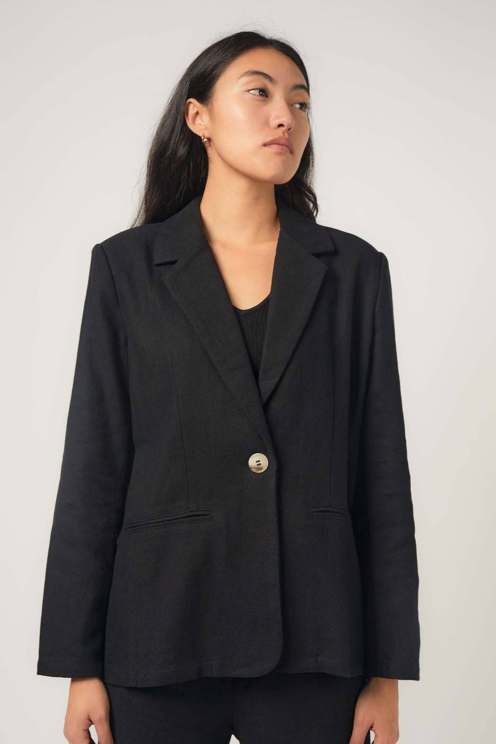 El chaleco Abri es una prenda confeccionada a medida con un corpiño clásico y ajustado con un toque moderno añadido. Presenta un corte en la espalda con una correa ajustable en la cintura y detalles con botones de tortuga negros.