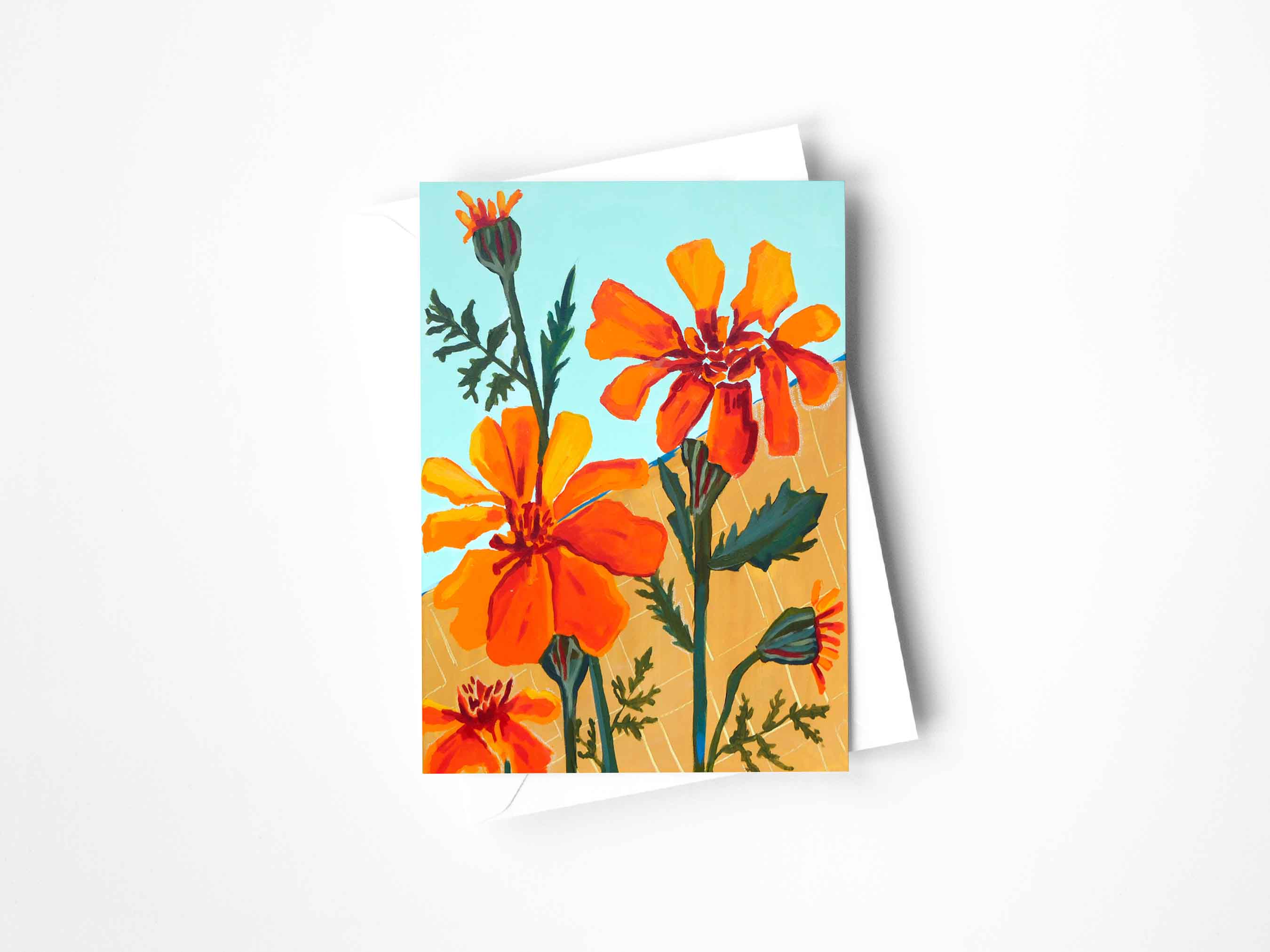 Tarjeta plegada A2 de 4,25" x 5.5" Interior en blanco. Papel de cubierta con certificación FSC 130#. Sobre blanco. Cuenta con obras de arte originales. Diseñado e impreso en Colorado.