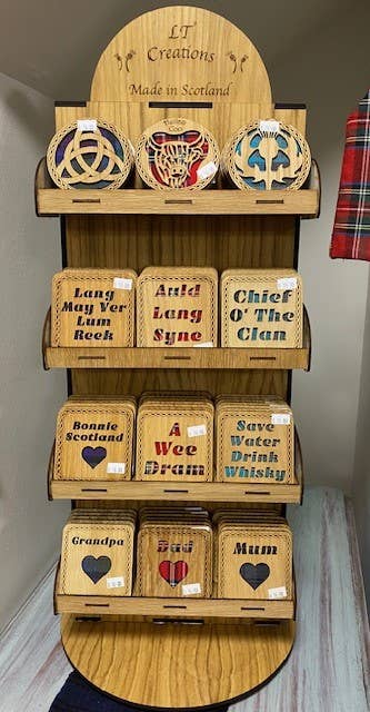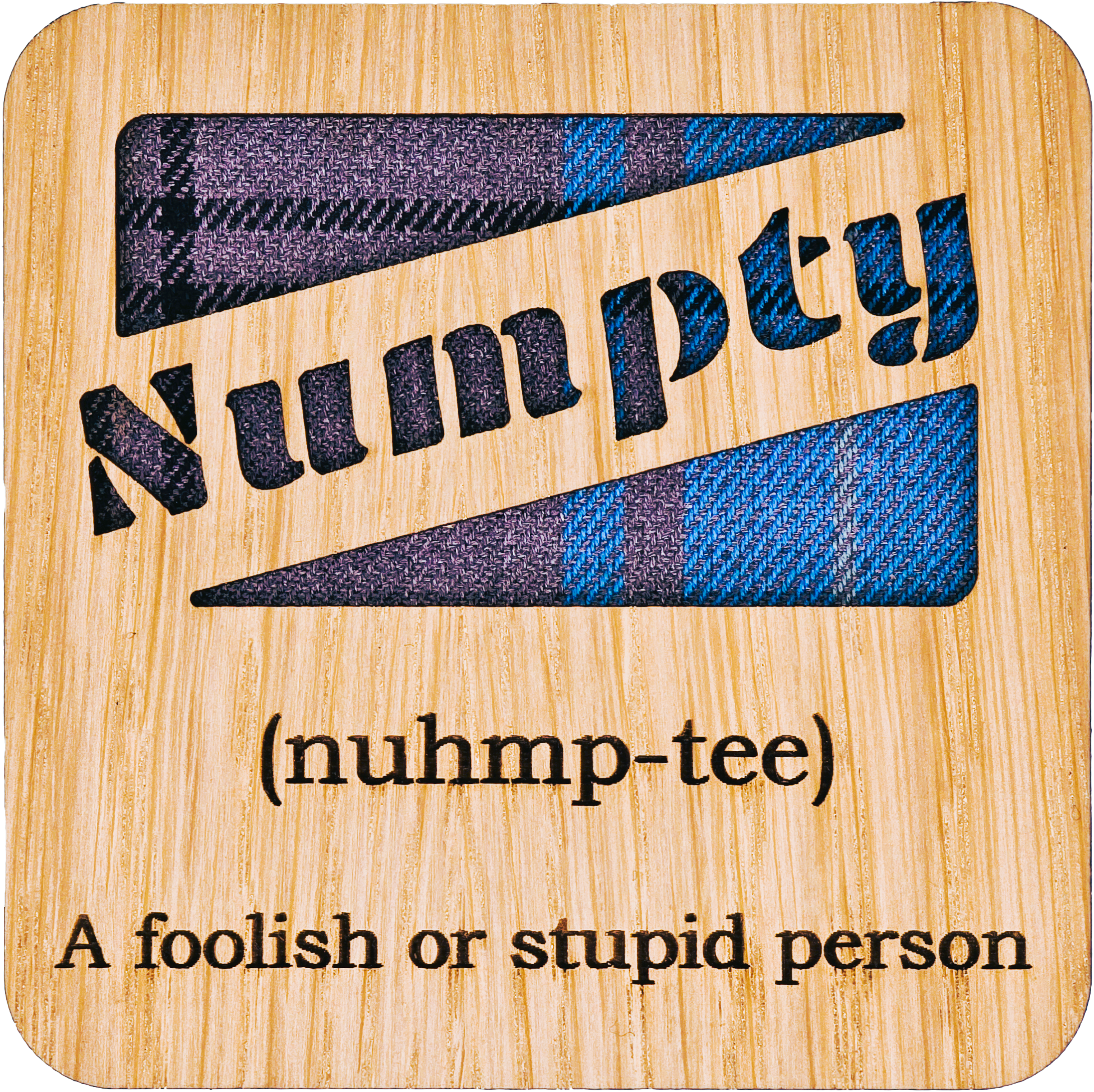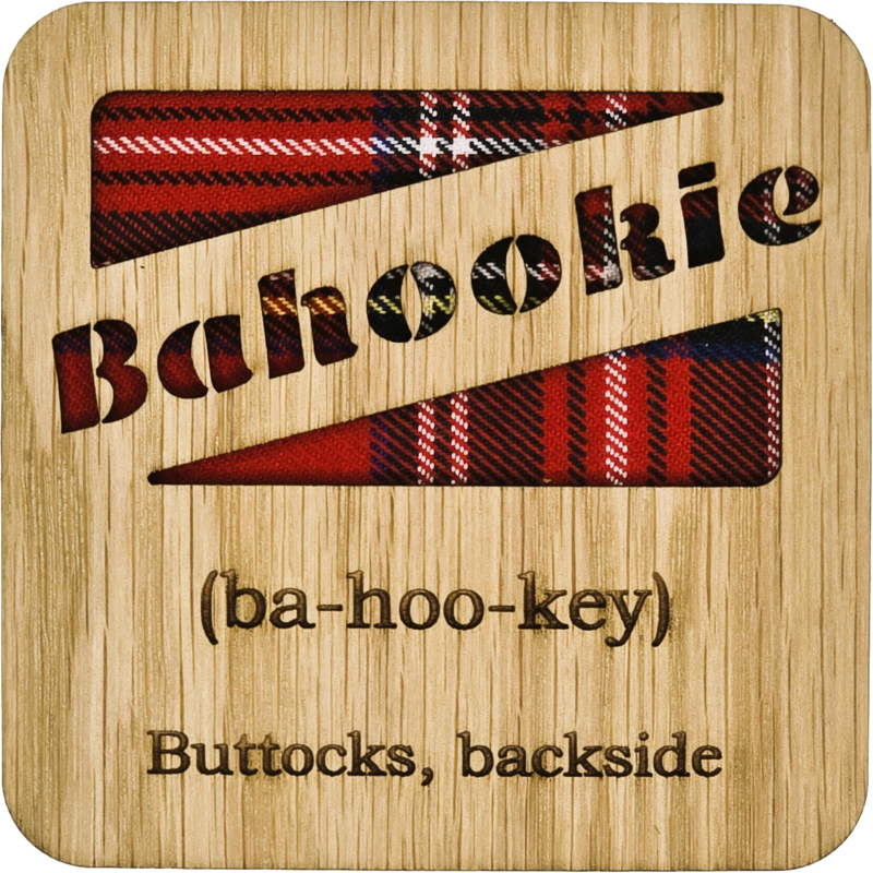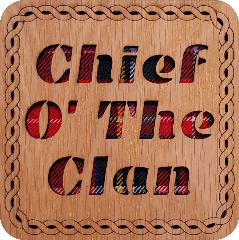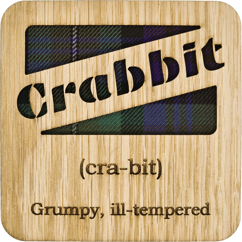 Posavasos cuadrados Fannybaws, fabricado en madera chapada de roble con fondo de tartán. Todos los posavasos están acabados con una base de fieltro. Hecho en Escocia.