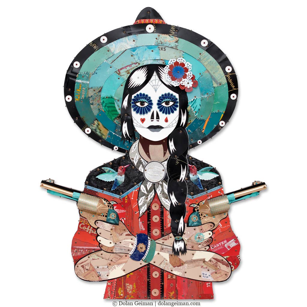 Un conjunto de dos revólveres vintage de técnica mixta con elementos de turquesa hechos de metal reciclado y objetos encontrados sobre un respaldo de madera. Decoración icónica de pared de vaquero occidental para interiores vintage modernos. *Hecho por encargo. Se envía en 10-12 semanas. La obra de arte variará de las fotos. *Medio: metal reciclado, madera, materiales recuperados y otros objetos encontrados *Tamaño: 13.75" H x 25.75" W x 2" D *Herrajes: listo para colgar con alambre en la parte posterior *Parte de una serie limitada, cada uno producido con un conjunto único de material rescatado Arte de pared occidental hecho de materiales reciclados. Arte de pared de vaquero vintage