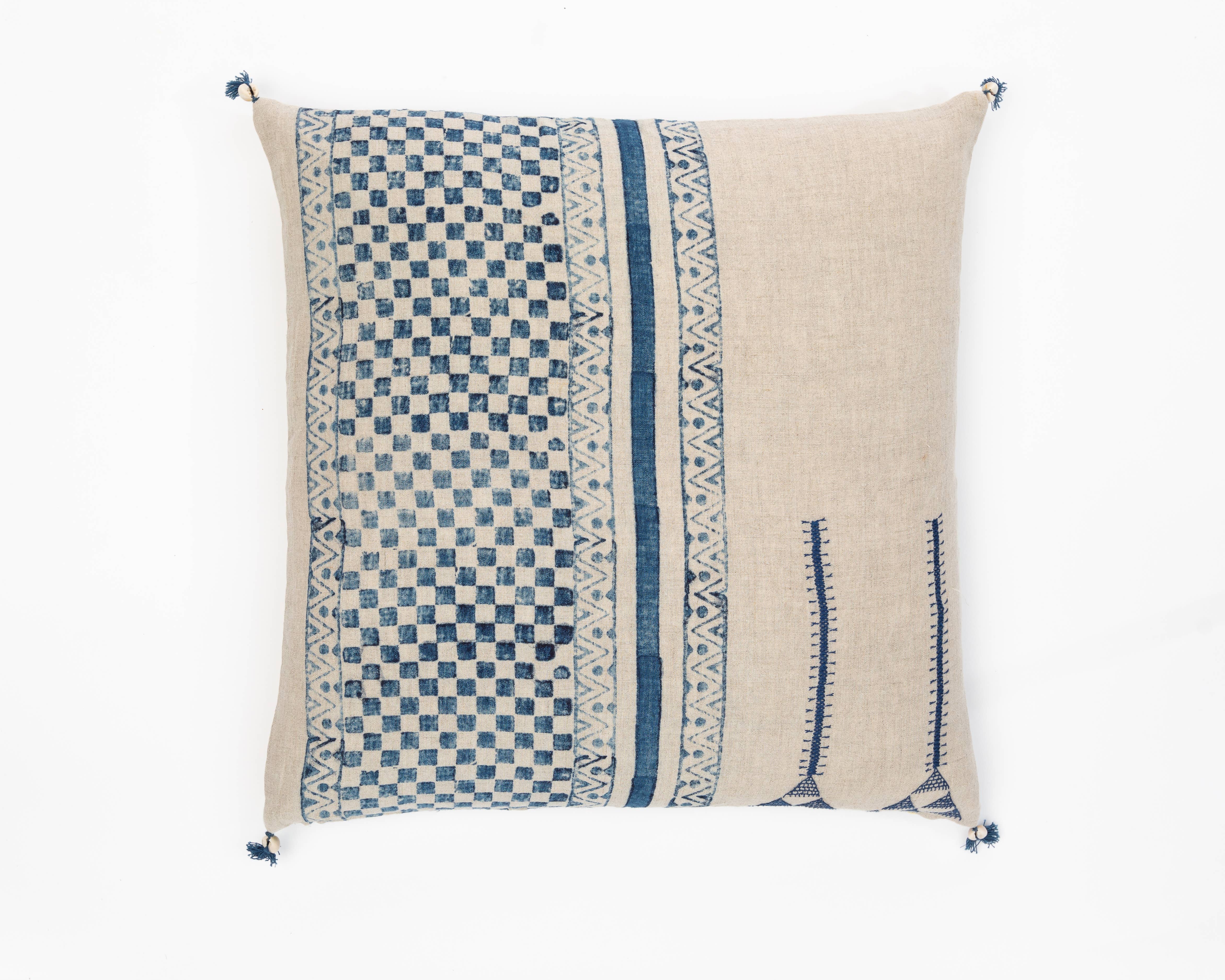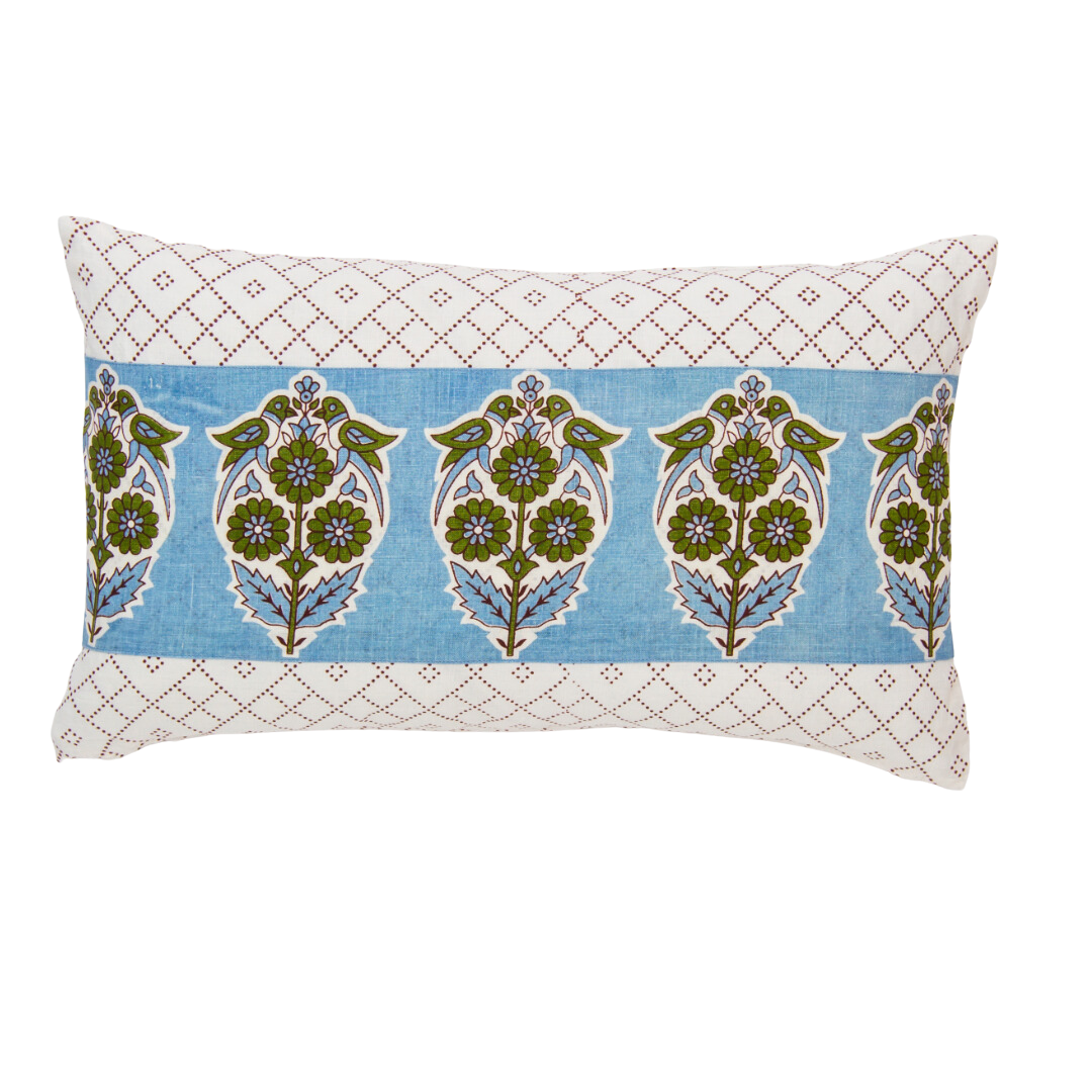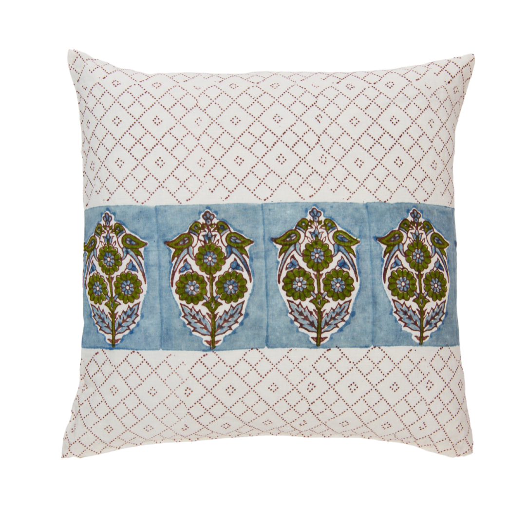 Impresión hermosa, vaporosa y exótica en lino. Cojín de lino de 20 x 20 forrado en algodón fino. Cierre de cremallera oculto. Relleno no incluido. Azul aciano y verde musgo impresos en lino concha. Hecho a mano en India.