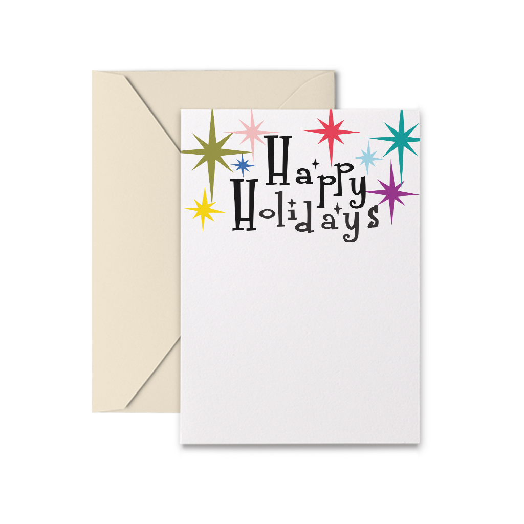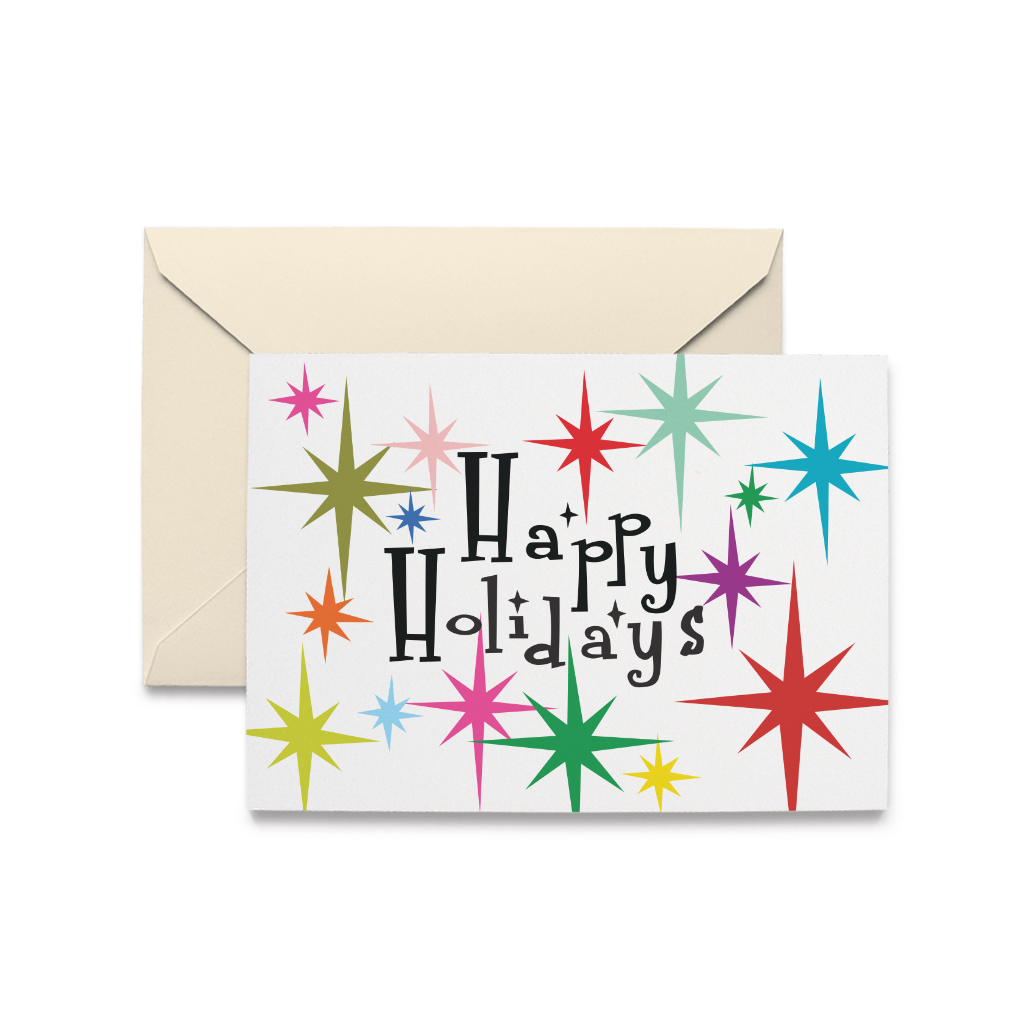 El interior de la tarjeta está en blanco Detalles de la tarjeta Tarjeta plegada de 4 5/8» x 6 1/4» papel de color natural con sobre a juego empaquetado en una caja transparente de 10 o una funda de violonchelo para una sola Mantente en contacto y esparce un poco de alegría.