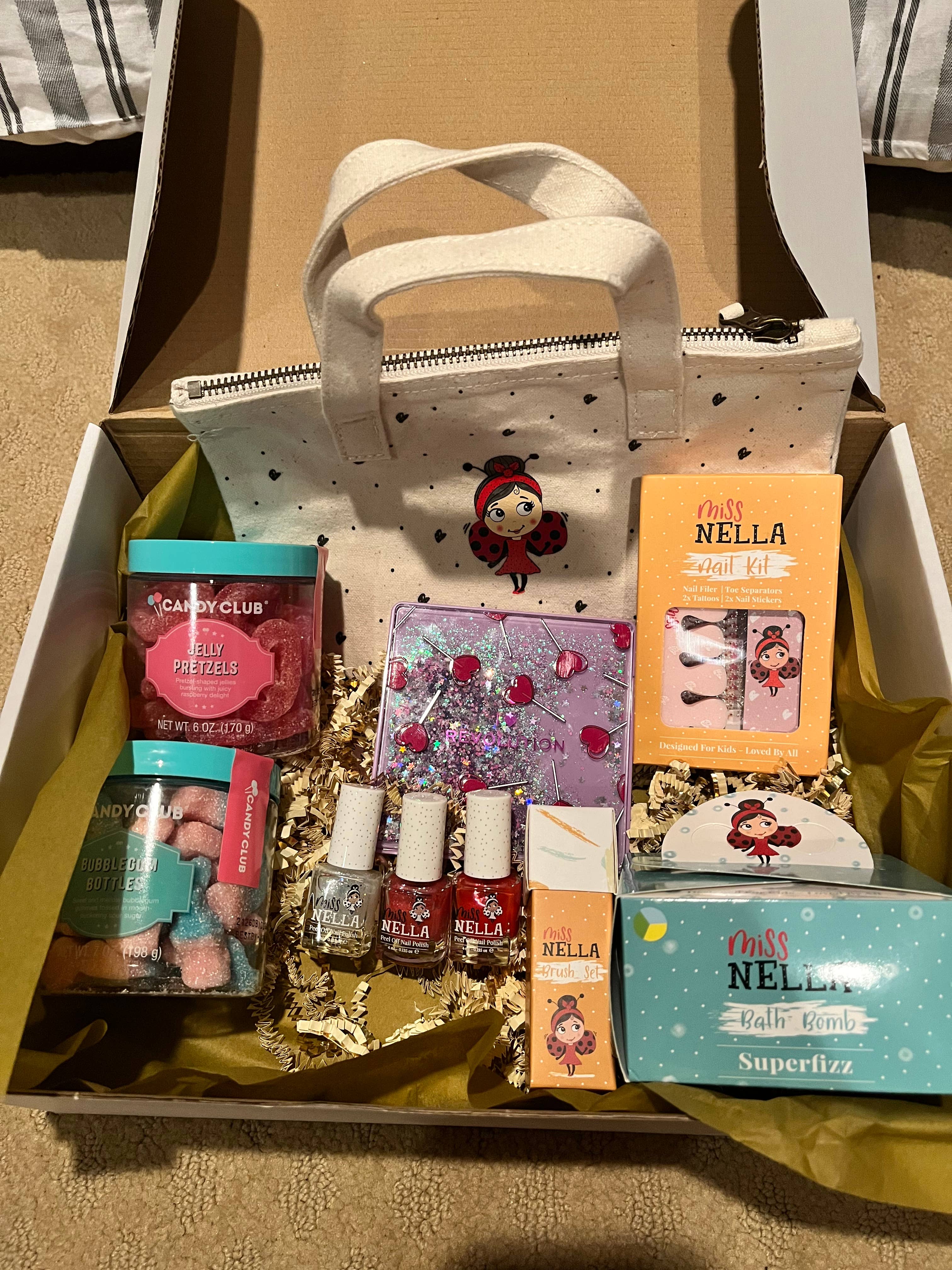El set de uñas y accesorios de la marca Miss Nella incluye una lima de uñas, un par de separadores para dedos, dos juegos de divertidos adhesivos para uñas y dos hojas de tatuajes temporales en diferentes tamaños.