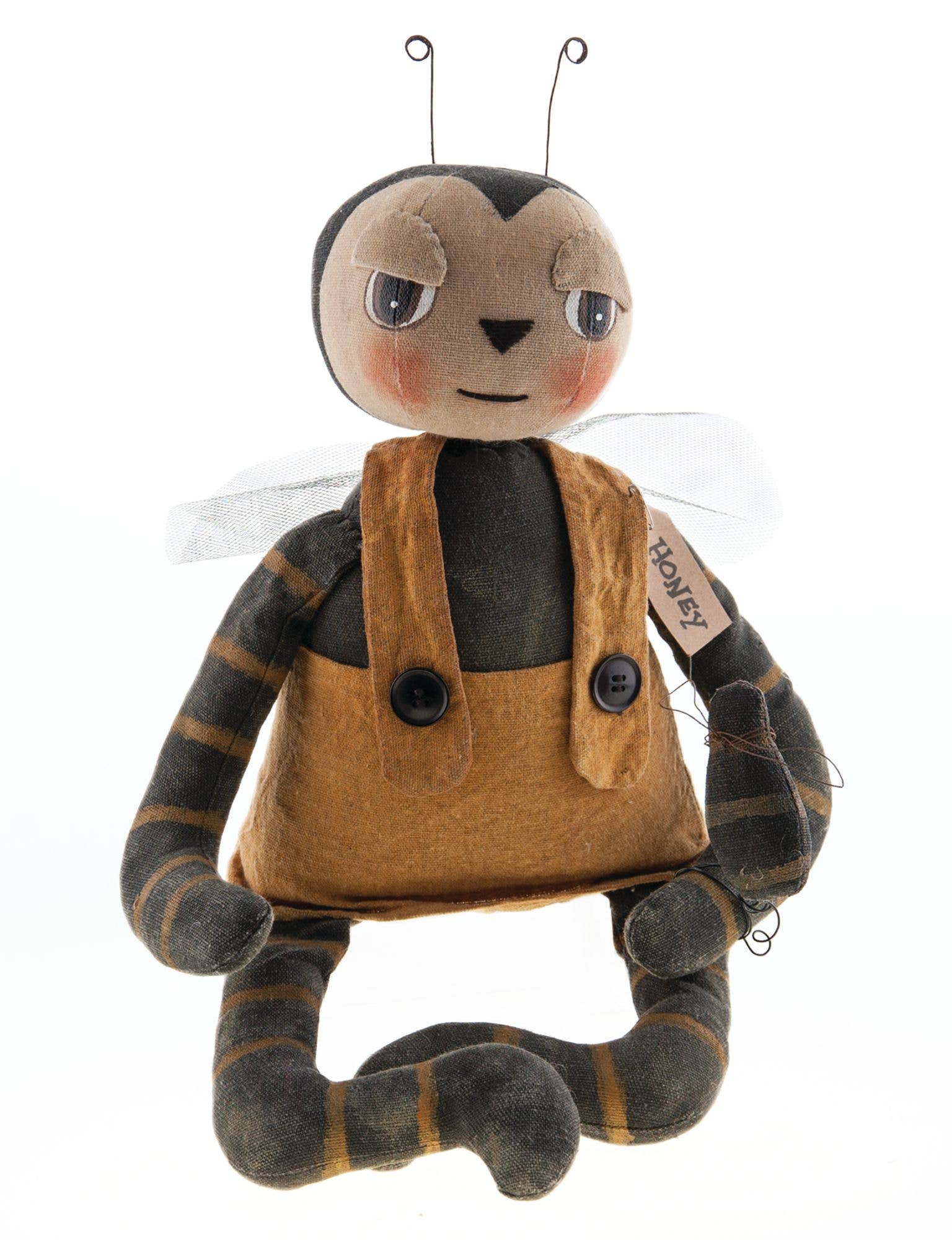 La muñeca Lil' Honey Bee Doll es una muñeca primitiva con alas de tela negra, un cuerpo a rayas negras y amarillas, una bufanda de gasa, sensores de metal y una cuerda negra para colgarla. La muñeca está desgastada con tela teñida para darle un aspecto vintage que complementa la decoración rústica y mide 10 pulgadas de alto por 7 pulgadas de ancho por 2 pulgadas de profundidad.