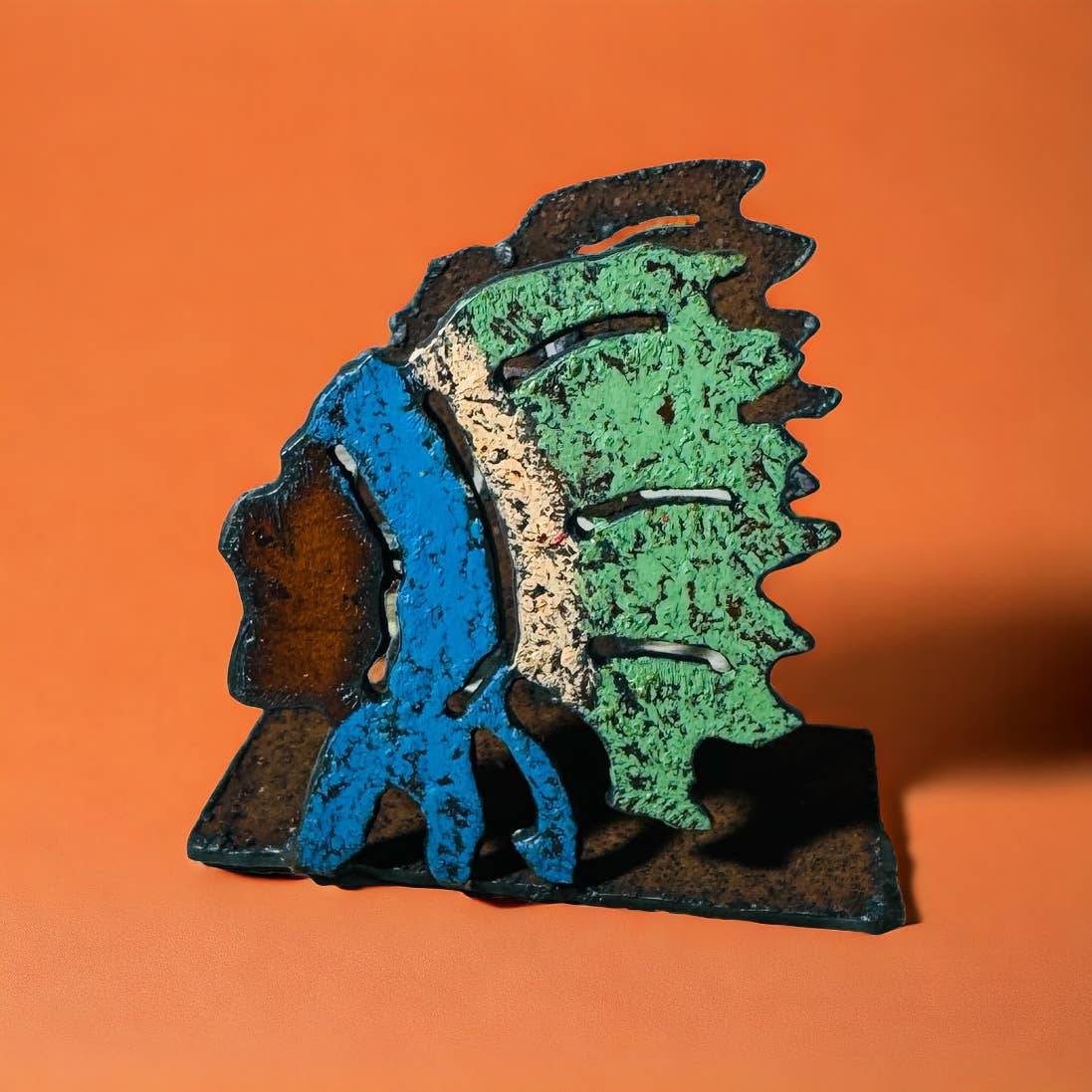 Diseño rústico urbano de soporte para correos/servilletas. De doble cara. Rectificamos el óxido y se muestra el metal plateado. Un regalo verdaderamente único que garantiza una sonrisa. Pieza de arte de metal duradera que puede usarse en interiores y exteriores. Fabricado en EE. UU. (Fate, Texas).
