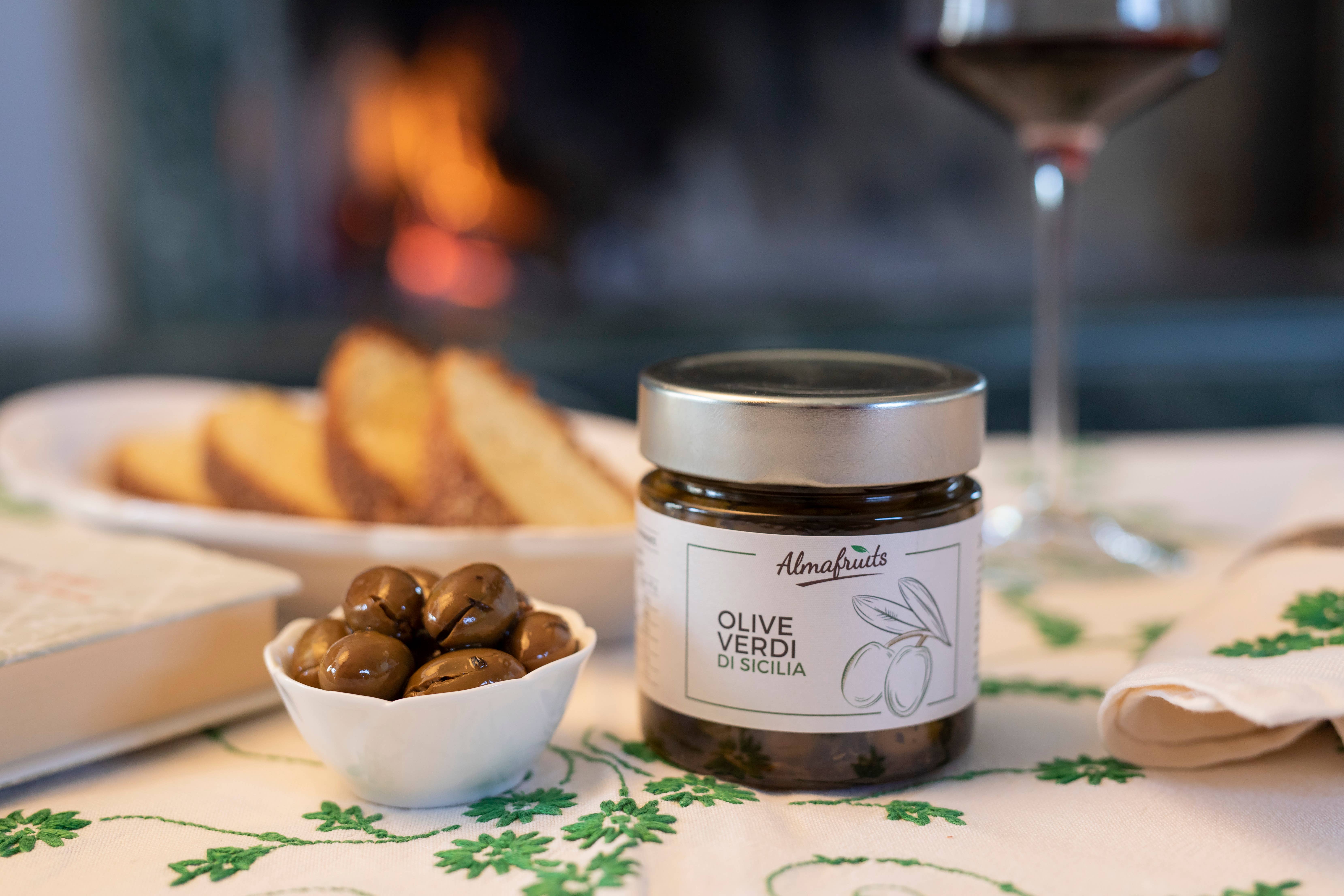 Frasco de aceitunas verdes Picholine con chile. Esta variedad de aceituna se caracteriza por su firmeza, textura crujiente y sabor único. Peso neto: 350 g.