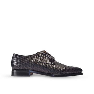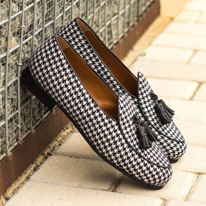 CARACTERÍSTICAS * Modelo: zapatilla belga * Materiales: becerro de caja negra, becerro pintado de negro, caimán exótico marrón oscuro * Forro: forro de piel de becerro color canela * Suela: suela de piel tipo pantufla burdeos * Último: Wellington * Atributo de acabado: acabado estándar * Tiempo de producción hecho a mano: plazo de entrega de 4 semanas