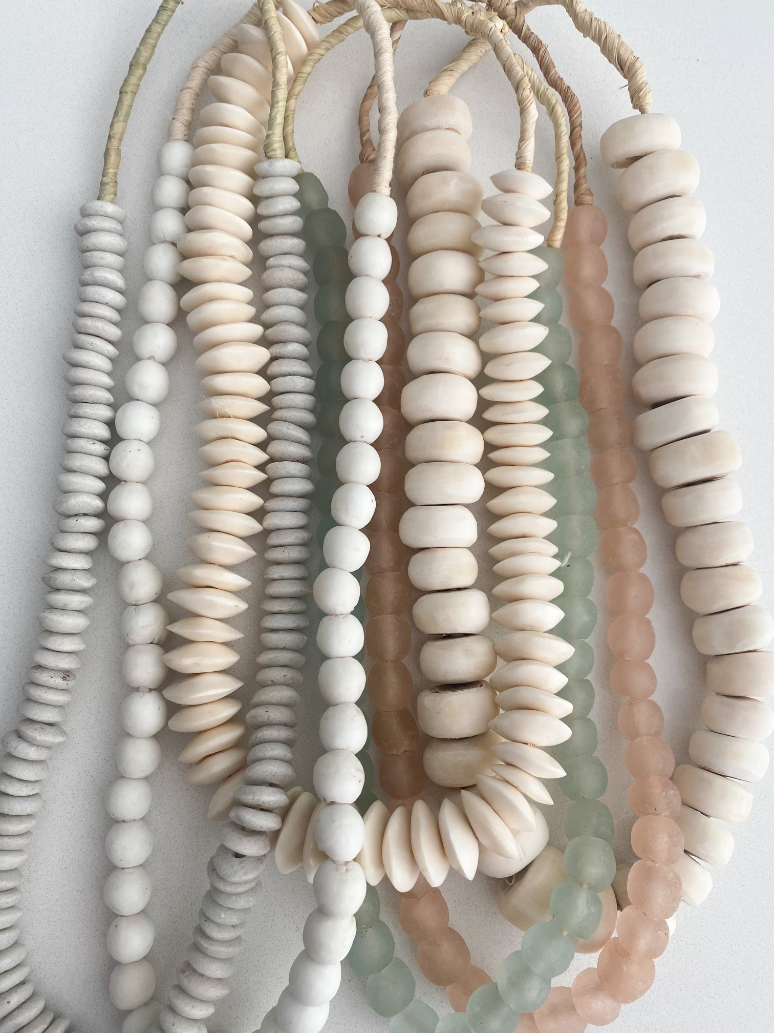 Echale un buen paso a esta hermosa hebra de abalorios de arena blanca de Ghana, África Occidental. El proceso de fabricación de estas cuentas es único en África y se ha utilizado durante más de 1000 años. El vidrio pulverizado de varios colores se vierte en un molde de arcilla, usando un tallo de yuca para el agujero de la perla. El molde se coloca en un horno y se calienta hasta que las partículas de vidrio se congela sin derretir realmente y el tallo se quema. Los ghaneses han estado haciendo cuentas de esta manera desde el siglo XVII.