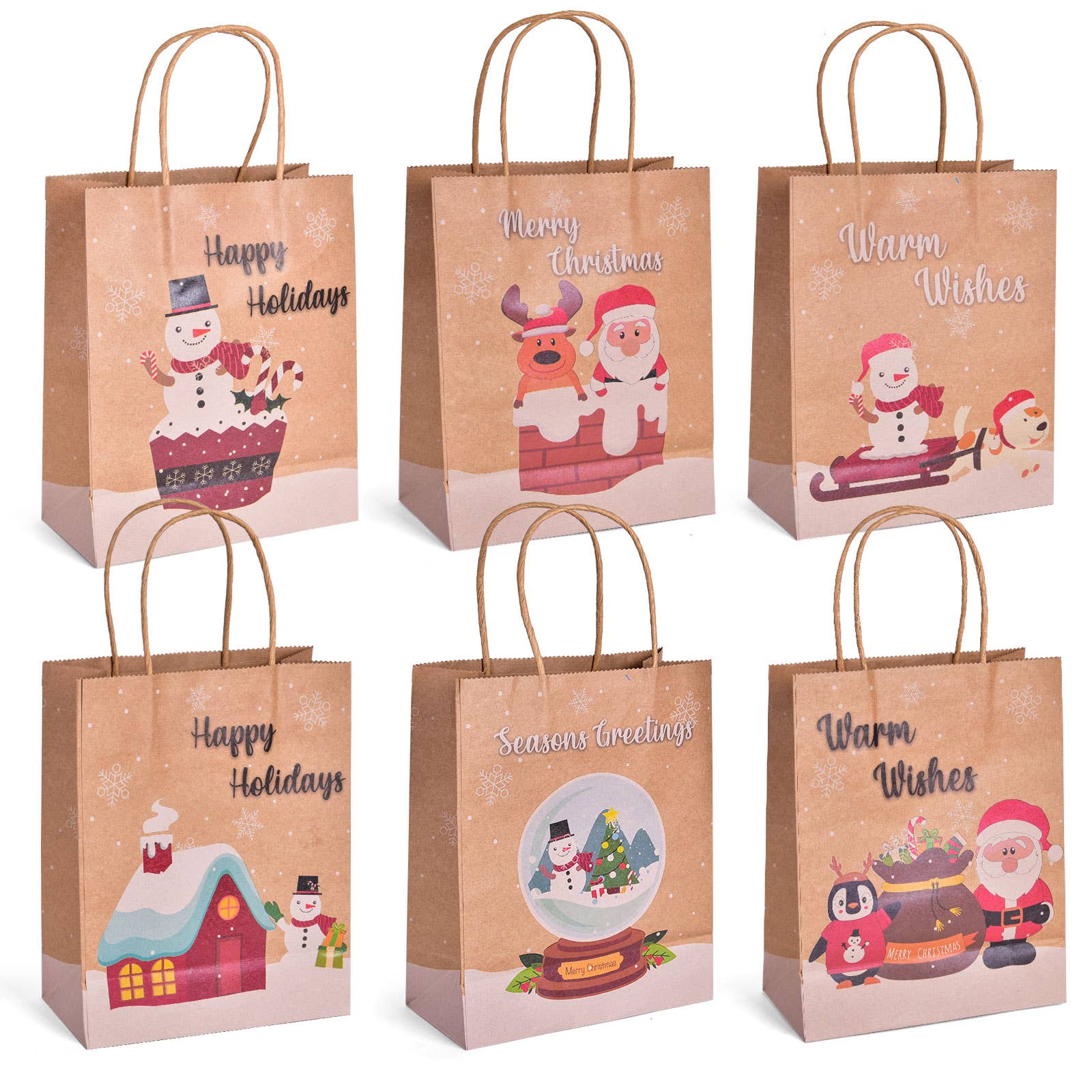 Colección de regalos navideños: Este set incluye 30 bolsas de regalo con 6 diseños festivos diferentes, con 5 bolsas por diseño. Son ideales para bolsas de regalo en fiestas navideñas o regalos para eventos de oficina. Bolsas navideñas de calidad: Cada bolsa mide 19 cm de largo, 11 cm de ancho y 23 cm de alto, y están hechas completamente de papel kraft de alta calidad que ofrece la resistencia y grosor adecuados para contener regalos para familiares y amigos. Diseños impresionantes de temporada: Los 6 diseños incluyen símbolos navideños clásicos y temáticos, destacando 5 bolsas con el mensaje “Merry Christmas” en colores vivos, 5 bolsas con copos de nieve clásicos, 5 con el mensaje “I Wish You A Merry Christmas” y otros patrones festivos.