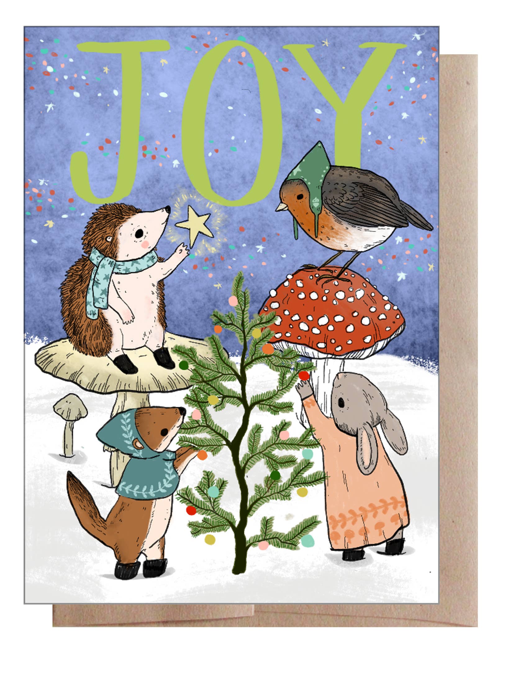 ¡Difunde ALEGRÍA en estas fiestas con esta tarjeta! La tarjeta es A6 de 4.5 x 6.25 pulgadas y viene con un sobre y una funda para protegerla. Las tarjetas están dobladas y en blanco por dentro. El sobre es Kraft Brown. Impreso profesionalmente en cartulina natural mate gruesa. Impreso en EE. UU.