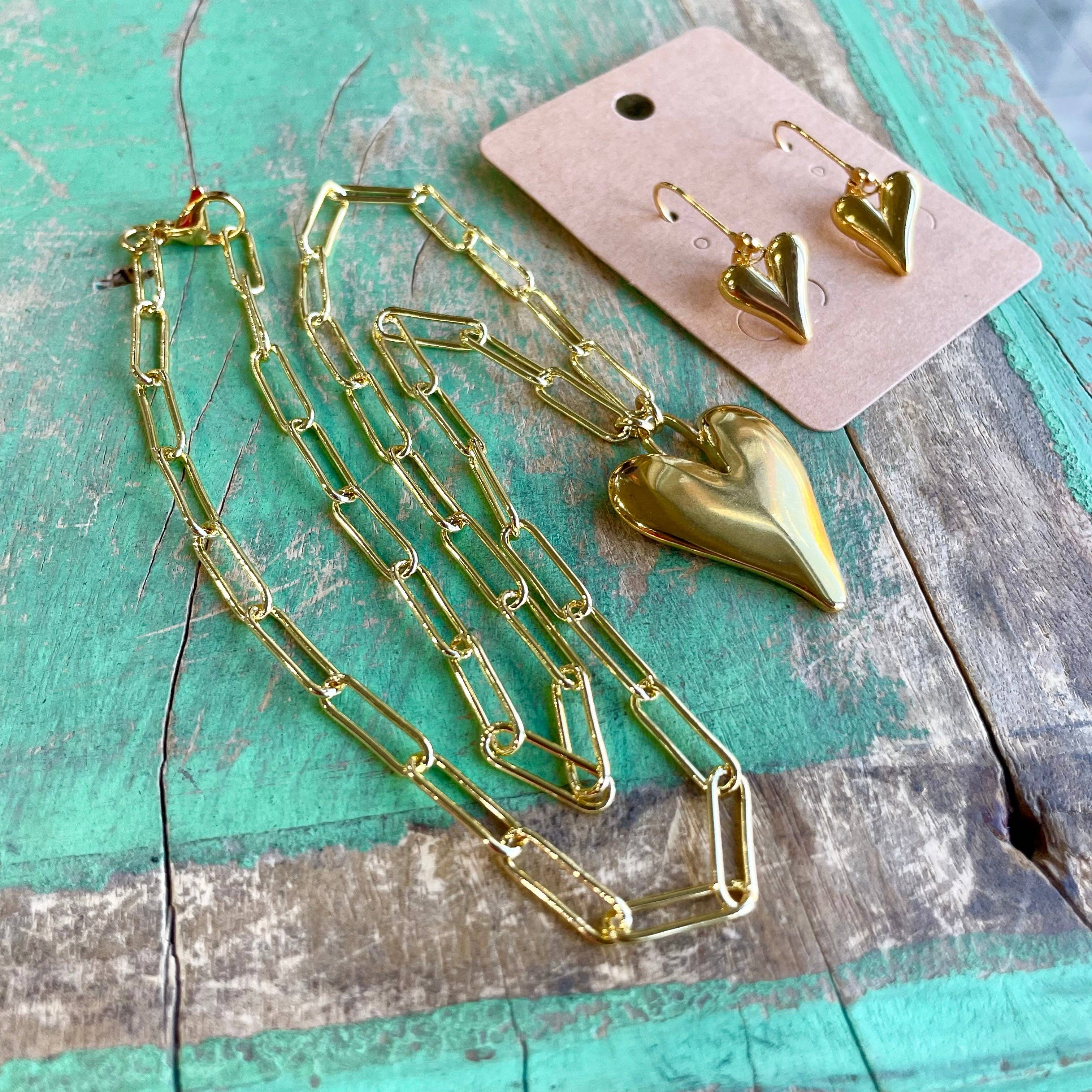 Acero inoxidable dorado. Cadena de clip de papel de 7,5” de grosor con colgante de corazón abultado de 1 1/4”.