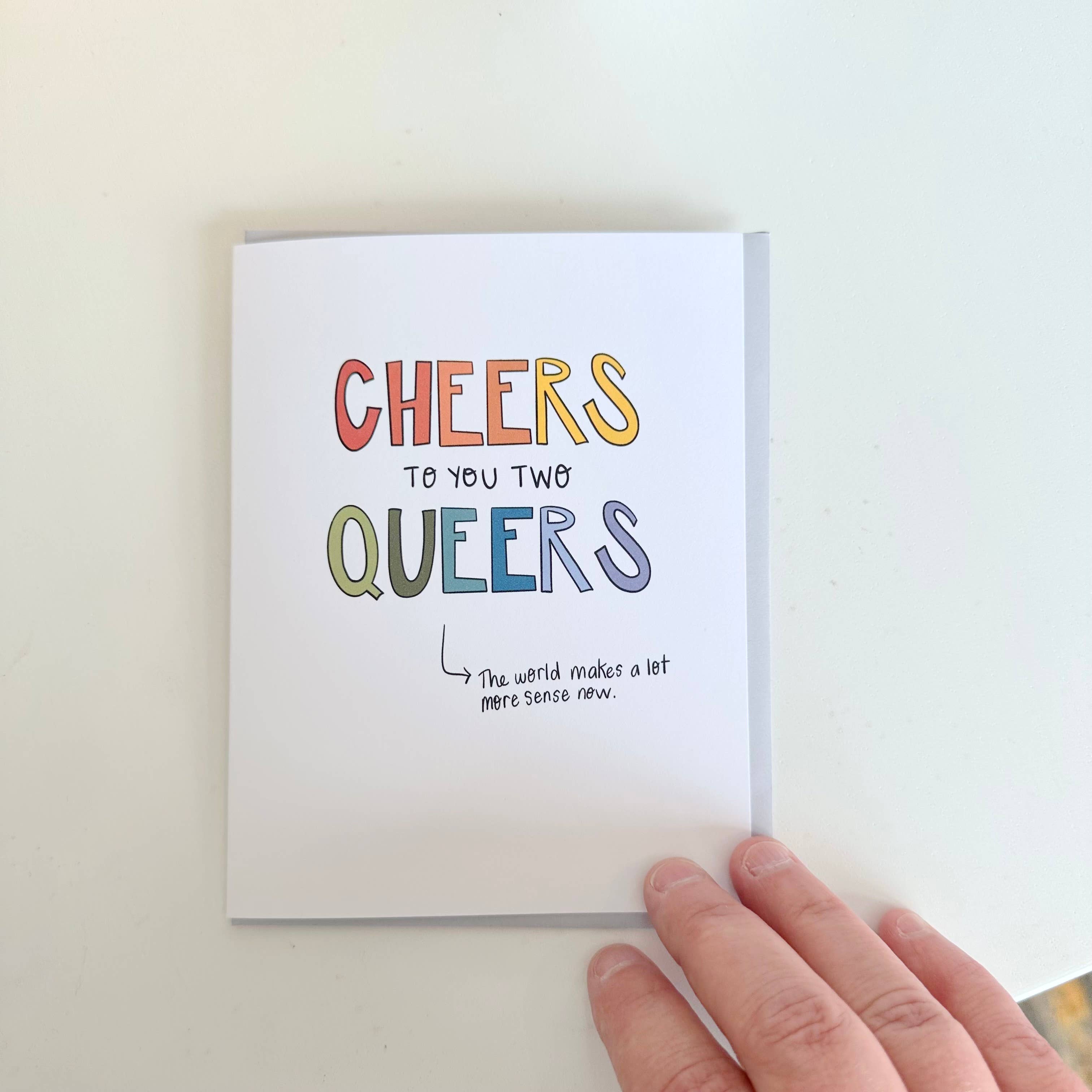 Afuera: Don, conocemos nuestra ropa gay. Interior: en blanco. Tamaño: 4.25 x 5.5 pulgadas. Sobres reciclados, a juego. Papel blanco brillante, reciclado, pesado. Tinta de archivo. Viene empaquetado en una funda transparente para su protección. Talla: A2.