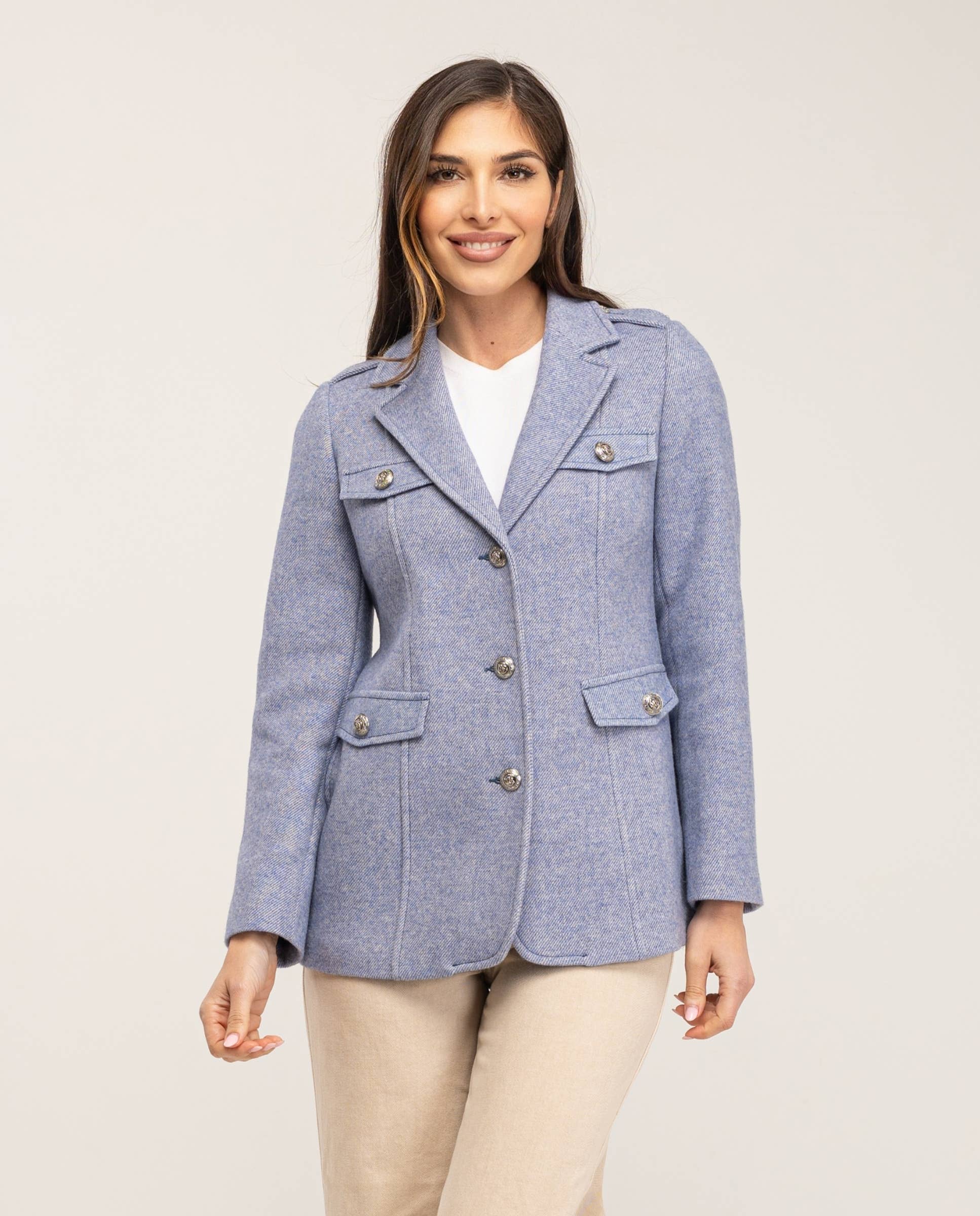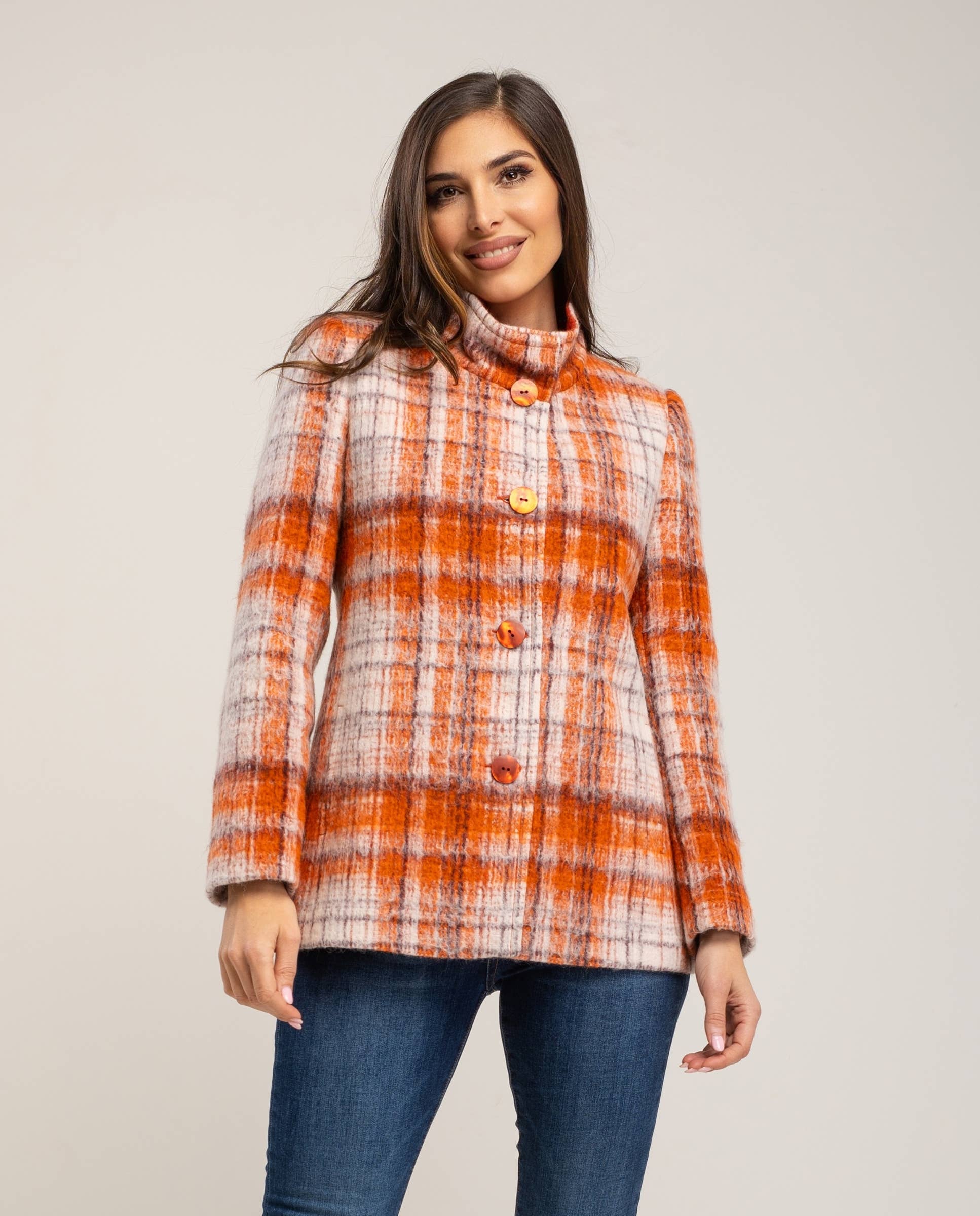 Chaqueta semientallada con corte horizontal marcando la cintura, cuello Mao, manga sastre, bolsillos en costura vertical y botonadura central, el cuello y los interiores de la prenda son de color liso combinando con el de los cuadros, forro interior, largo de la prenda 65 cm. Fabricado en España.