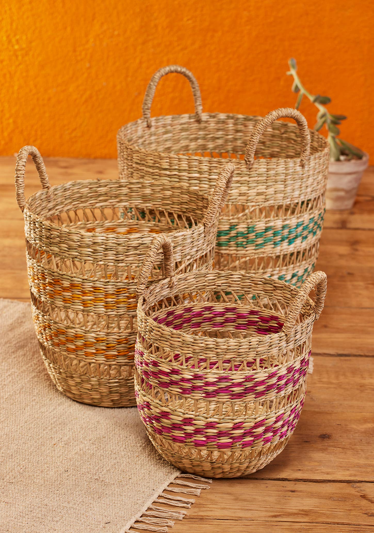 Un juego de cestas para macetas de pastos marinos a rayas. Cada uno de los 2 llamativos diseños de colores está forrado con plástico para plantarlos directamente. Con un tejido natural que contrasta con los colores rosa, turquesa y amarillo, este es un par de macetas prácticas y elegantes que combinan o contrastan eficazmente con la decoración de la habitación. Los pastos marinos fuertes, duraderos y sostenibles son ideales para hacer cestas multifuncionales para almacenar, transportar o cubrir. Es ligero y naturalmente resistente a las manchas. 20 x 16 cm de largo x 14 cm de ancho Hierbas marinas 20 x 16 cm de largo x 14 cm de ancho x 11 cm. Estas hermosas artesanías provienen del hogar de antiguos templos y pagodas en el norte de Vietnam. Nuestro proveedor se compromete a producir productos tradicionales y culturales que aún tengan un lugar en la sociedad moderna. Los diseños bien pensados se crean a partir de materiales sostenibles y respetuosos con el medio ambiente, que reflejan la experiencia de los artesanos vietnamitas situados en un centro histórico para el budismo.