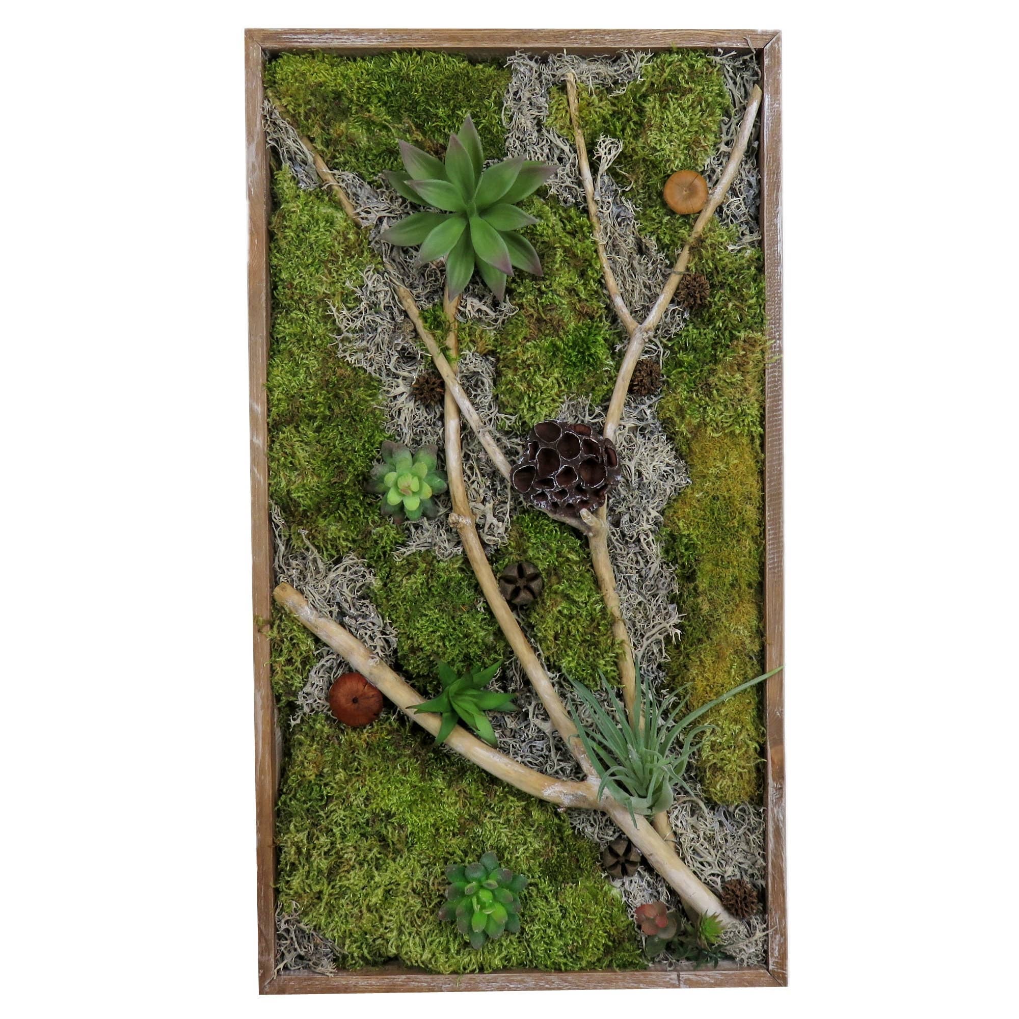 Decoración de pared con musgo, madera y plantas artificiales para el hogar al por mayor