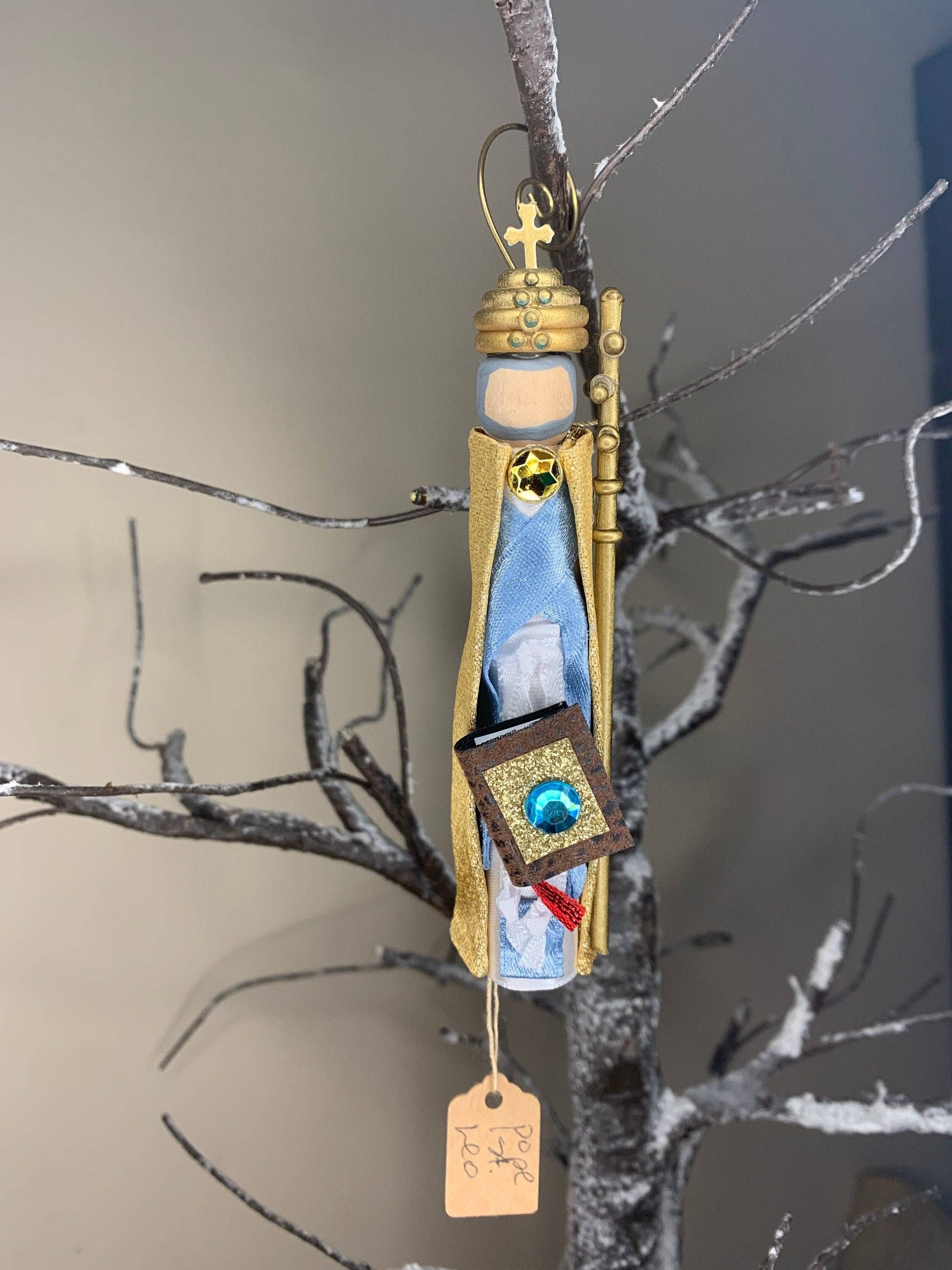 Adorno de muñeca de madera original de San Roque (San Rocco) hecho a mano. Perfecto para el árbol de Navidad. Llévala el día de su fiesta o para una novena. Regalo para una celebración de cumpleaños o sacramento (bautismo, primera comunión, confirmación, órdenes sagradas, matrimonio). Regalo para maestros, sacerdotes y abuelos. Fiesta: 16 de agosto Nació en Francia con una marca de nacimiento de una cruz roja en el pecho, una señal de que la esterilidad de su piadosa madre había sanado. Hijo de un gobernador adinerado, entregó su herencia a los pobres e hizo una peregrinación a Roma. Cuidando a las víctimas de la peste, realizó muchos milagros al hacer la señal de la cruz sobre ellas. Cuando contrajo la enfermedad en la pierna, un perro encontró a Roch, llevándole comida diaria y lamiéndose las heridas.