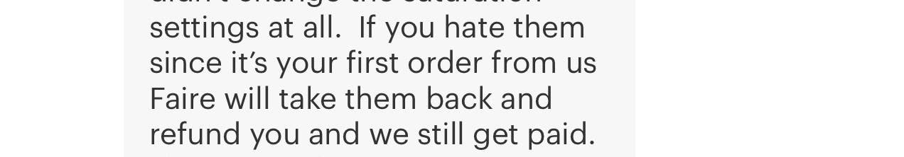 Lo que se anunció no fue en absoluto lo que se recibió para los adultos. El niño pequeño fue perfecto. Cuando me puse en contacto, solo estaban preocupados por asegurarse de poder quedarse con su dinero y no les importaba en absoluto cómo complacer al cliente o qué podían hacer para solucionarlo. Vea la captura de pantalla donde dicen "pida un reembolso a faire y nosotros aún podemos quedarnos con nuestro dinero". No lo recomiendo, especialmente porque lo que se anuncia no es lo que recibimos.