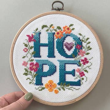 A todos nos vendría bien un poco de esperanza estos días, ¿no? Este es un bonito kit tipográfico de punto de cruz para coser con esperanza en el corazón. Un pedacito feliz de primavera/verano para coser, mientras estás bajo el sol (posiblemente con una buena copa de vino a tu lado), una bendición. Forma parte de un juego de tres, hay amor, esperanza y hogar para elegir, o por qué no coges los tres y los cuelgas como un juego. Está diseñado para principiantes competentes y solo utiliza puntos de cruz enteros. No dudes en ponerte en contacto conmigo si tienes alguna dificultad para entender el patrón o las instrucciones. Este kit contiene: Patrón de punto de cruz contabilizado Love Poppet Tela Aida de 14 puntos 13 hilos de bordar trenzados DMC Aguja de punto de cruz y un folleto de consejos y trucos para empezar El artículo fotografiado está cosido en una aida blanca de 14 hilos Puntadas: 69 x 68 Tamaño: aproximadamente 13 x 13 cm y cabe en un aro de 6 pulgadas. Colores: utiliza 13 colores DMC El kit viene en un sobre de cartón de 240 x 165 x 5 m