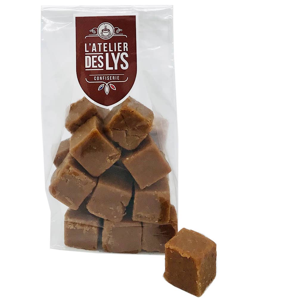 Bombonera de caramelos de mantequilla salada. ¡Disfruta de estas deliciosas golosinas caramelizadas! Son tiernas y realmente muy agradables al paladar con un sabor a caramelo perfectamente cocinado. ¡Cuidado, efecto adictivo garantizado! Embalaje individual Bombonera 320 gr CAJA PCB: 8 – DLUO: 8 meses Peso bruto: 320 gr La fabricación del producto se realiza íntegramente en el taller de los lirios por nuestro propio confitero.