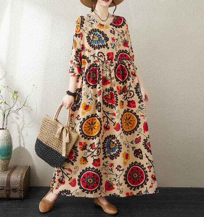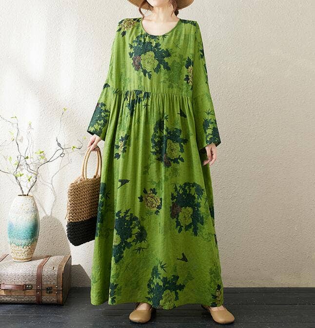 Este vestido presenta un estampado floral magenta vibrante, diseñado con cuello redondo y mangas largas. Su corte holgado proporciona una silueta cómoda y favorecedora, perfecta para un look artístico inspirado en las vacaciones. Ideal para salidas informales o escapadas navideñas, este vestido combina colores llamativos con un estilo sencillo, lo que lo convierte en una pieza destacada en cualquier armario.