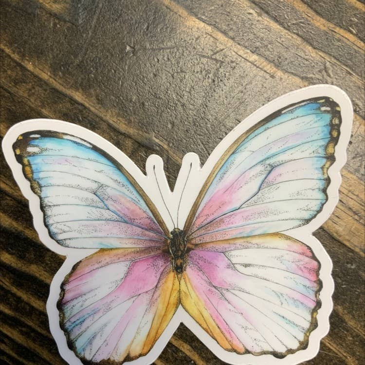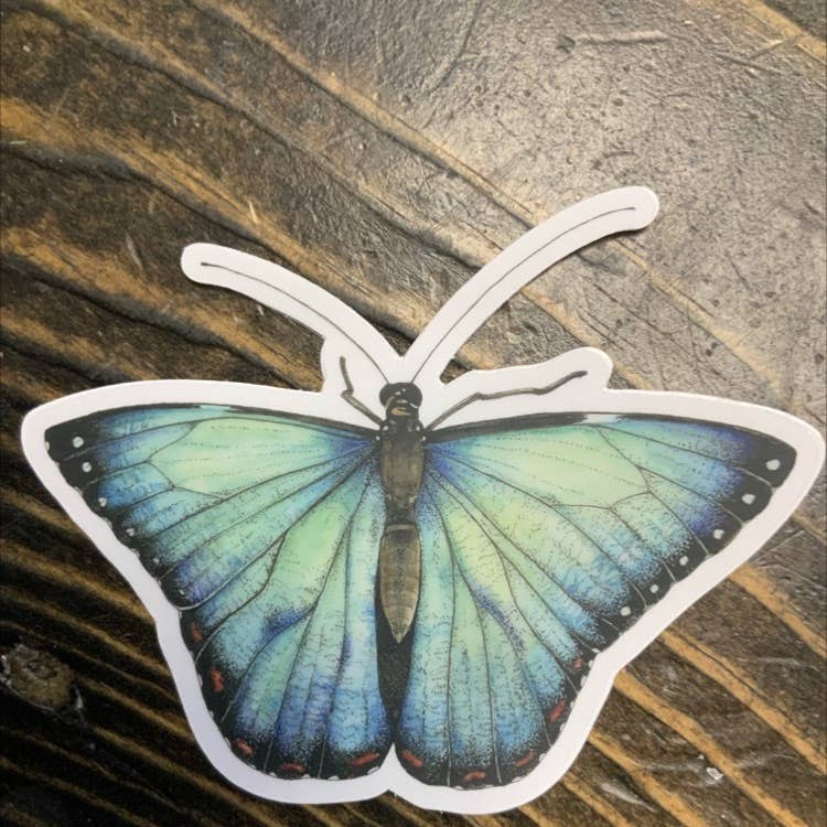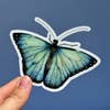 Calcomanía de vinilo transparente con diseño de mariposa azul, impermeable y troquelada