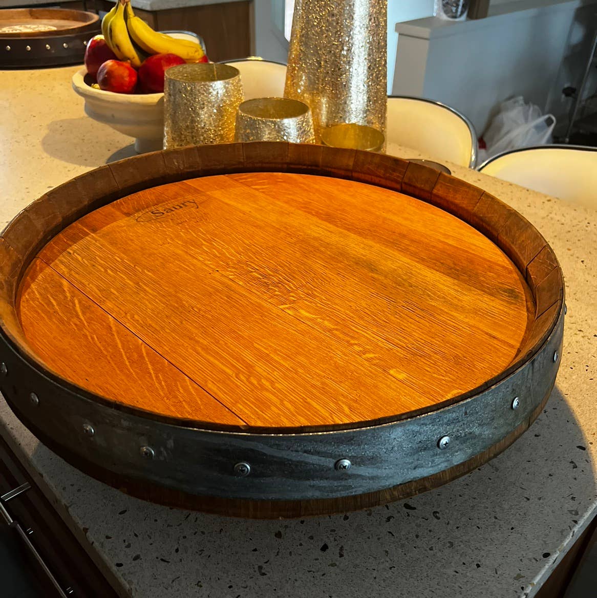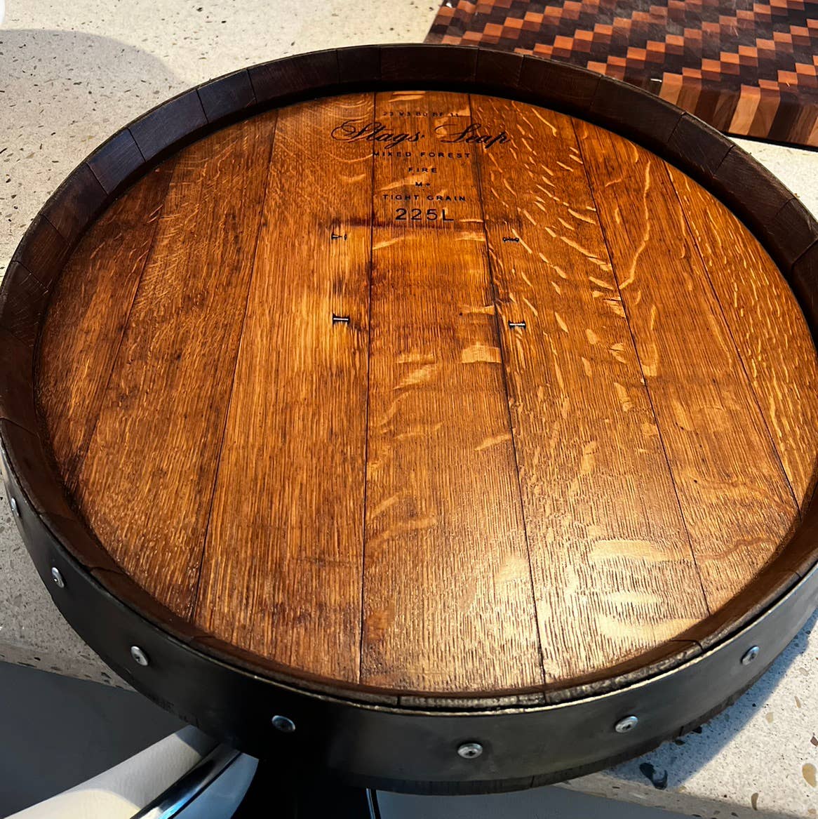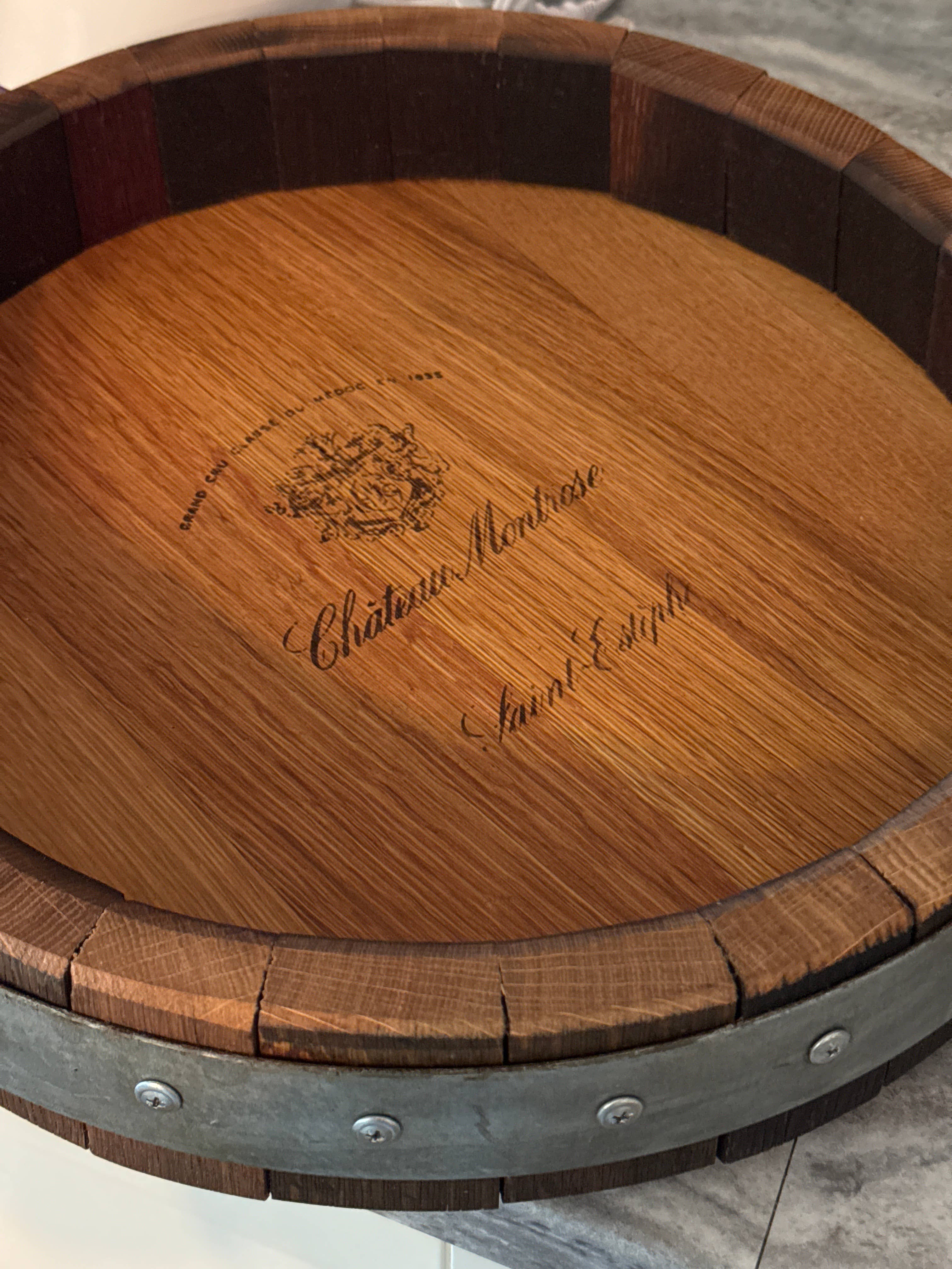 Directamente obtenida de los extremos de barriles de vino retirados de California. Cada tapa del barril tendrá un sello y marcas únicas. Disponible en cuatro acabados. Límpiela con un paño húmedo - No sumergir en agua. Diseñada para uso en interiores.