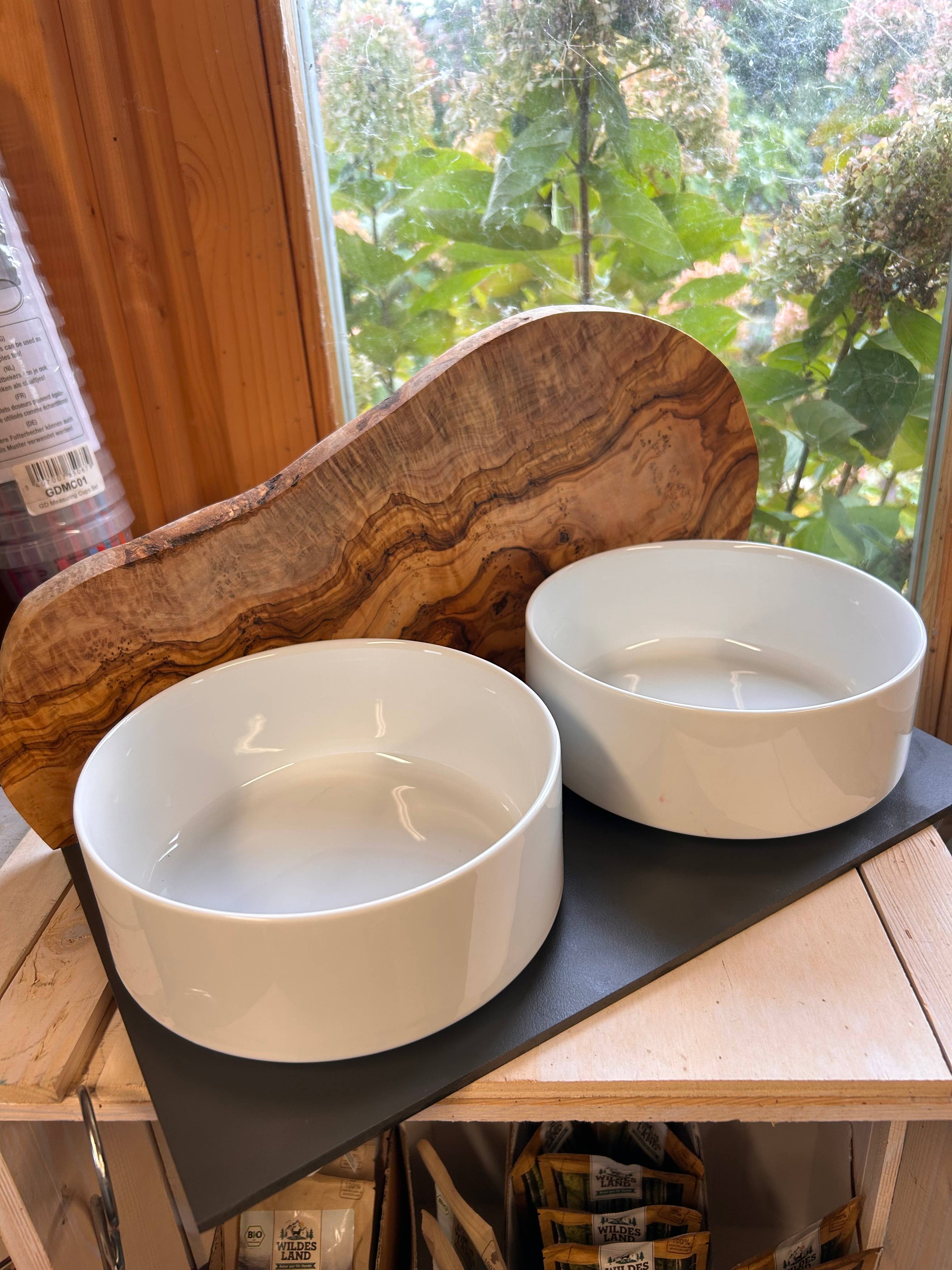 Para perros exigentes: dos cuencos blancos de porcelana de 1,5 litros cada uno para comida, sobre una base negra extremadamente resistente de 40 x 20 cm. El punto destacado es una tabla rústica sólida de madera de olivo que actúa como protector contra salpicaduras. El borde natural y rústico le da la apariencia de una montaña en esta combinación. Cuenta con pies antideslizantes que ofrecen una base fija y segura. Además, esta estación de alimentación puede fijarse a la pared para que el perro pueda comer a una altura ligeramente mayor, utilizando dos tornillos o cinta adhesiva de doble cara.