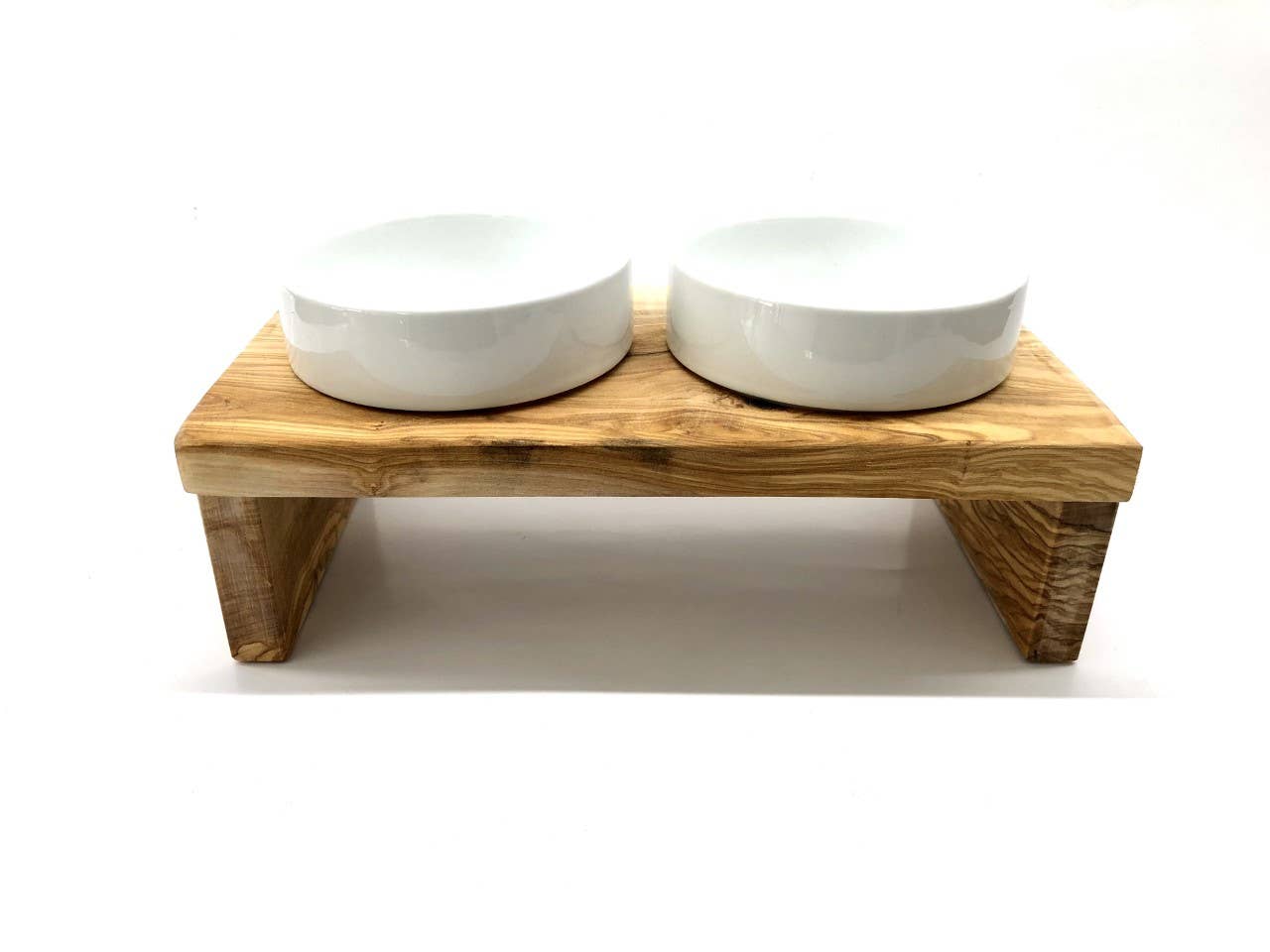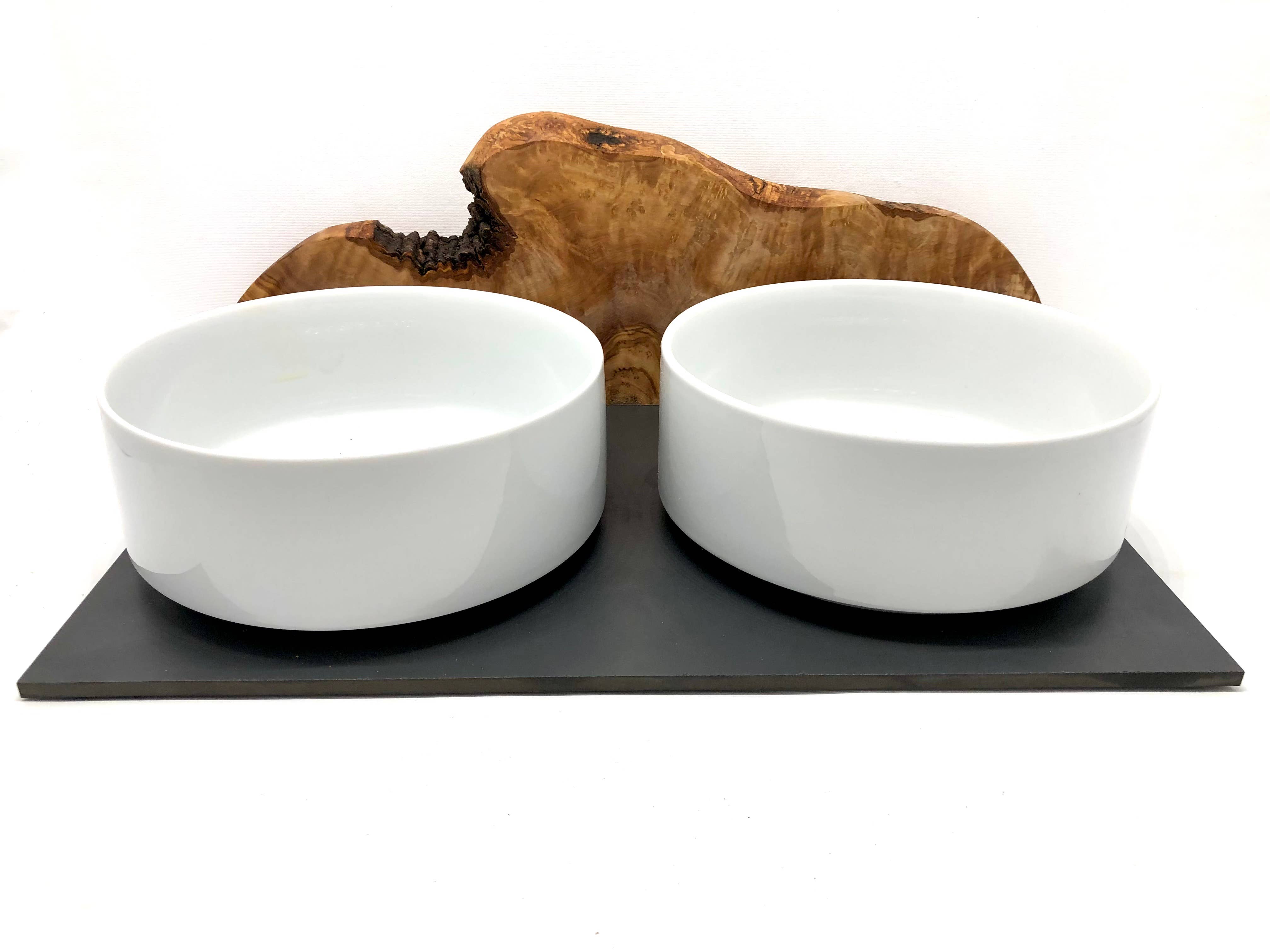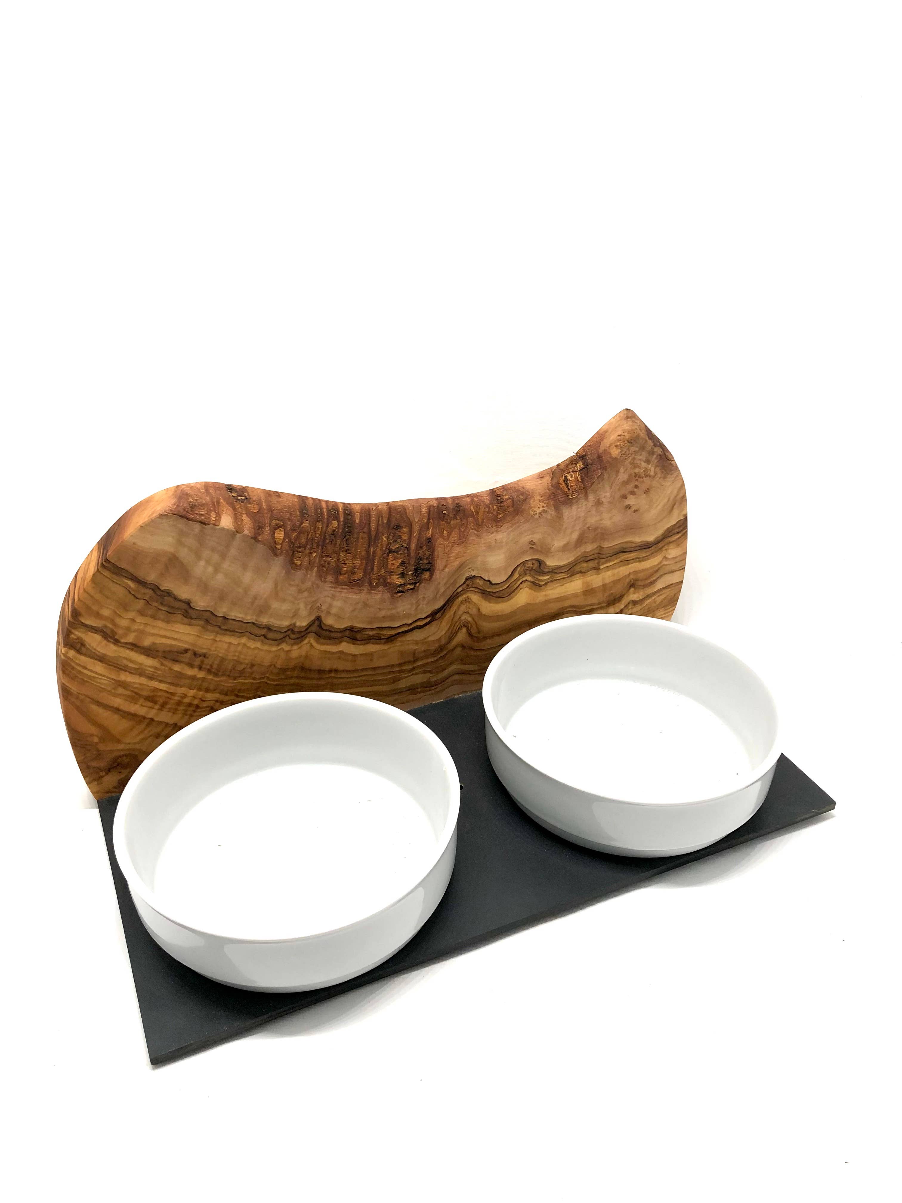 Estación de alimentación MOUNTAIN con 2 cuencos de porcelana de 1,5 litros y madera de oliva al por mayor