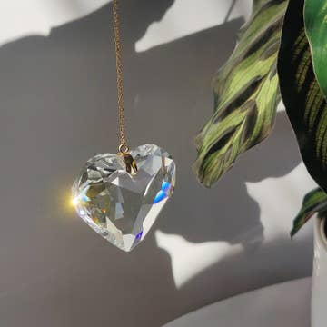 Vidrieras hechas a mano en diseño geométrico de cristal con piedra colgante de cuarzo. Mismo tamaño y colores de vidrio que el diseño de estacas de plantas Soldadura sin plomo. Creado con una variedad única de colores de vidrio opalizados, opacos y transparentes. Los colores varían debido al corte del cristal. Instrucciones de cuidado Se puede limpiar con una toalla o un paño húmedo. El latón y la soldadura se pátina de forma natural y se oscurecen con el uso.