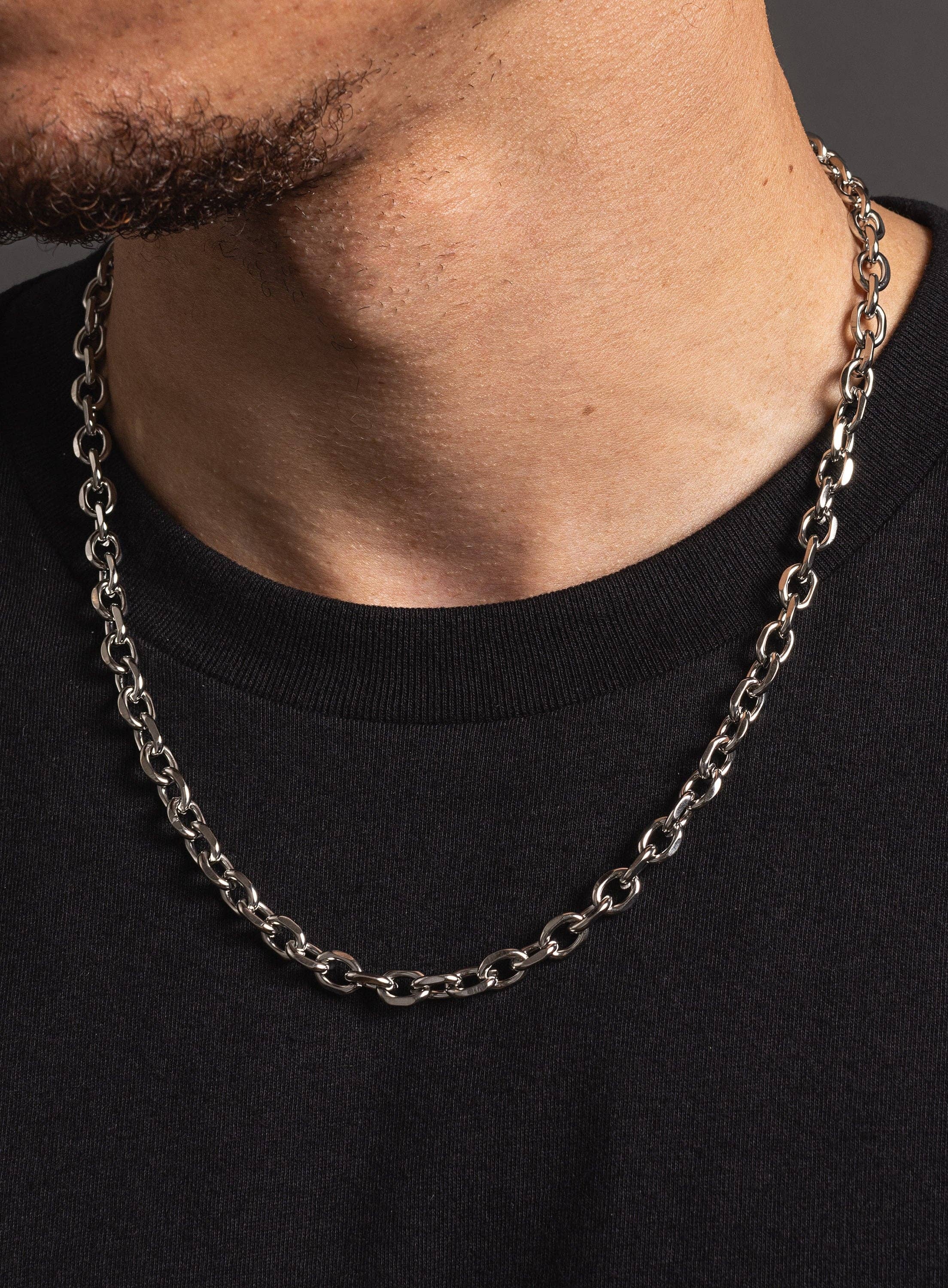 Collar de oro grueso para hombre, cadena de eslabones ovalados de acero inoxidable 316L, gruesa y gruesa, chapada en oro de 14 quilates, joyas de regalo para él Ancho de cadena: 7 mm Cierre: pinza de langosta Cadena: acero inoxidable 316L chapado en oro de 14 quilates Longitud: disponible en 16, 18, 20, 22 y 24. La modelo lleva una cadena de 20 pulgadas. Ten en cuenta que, según tu altura, complexión, hombros y cadena para el cuello, te quedará diferente. Mide tu longitud ideal antes de realizar el pedido.