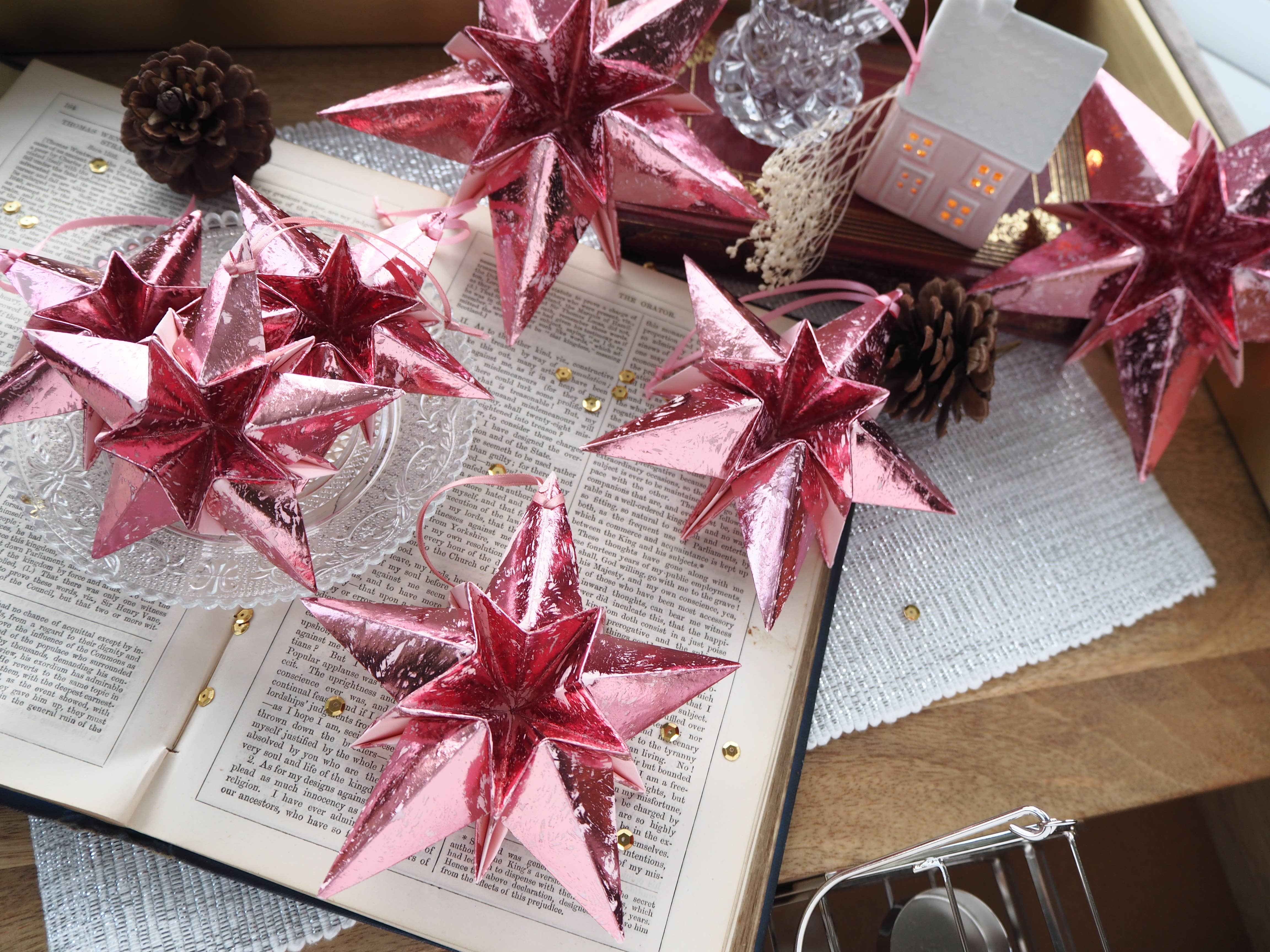 Estrellas de papel origami metálicas en rosa fucsia navideñas al por mayor