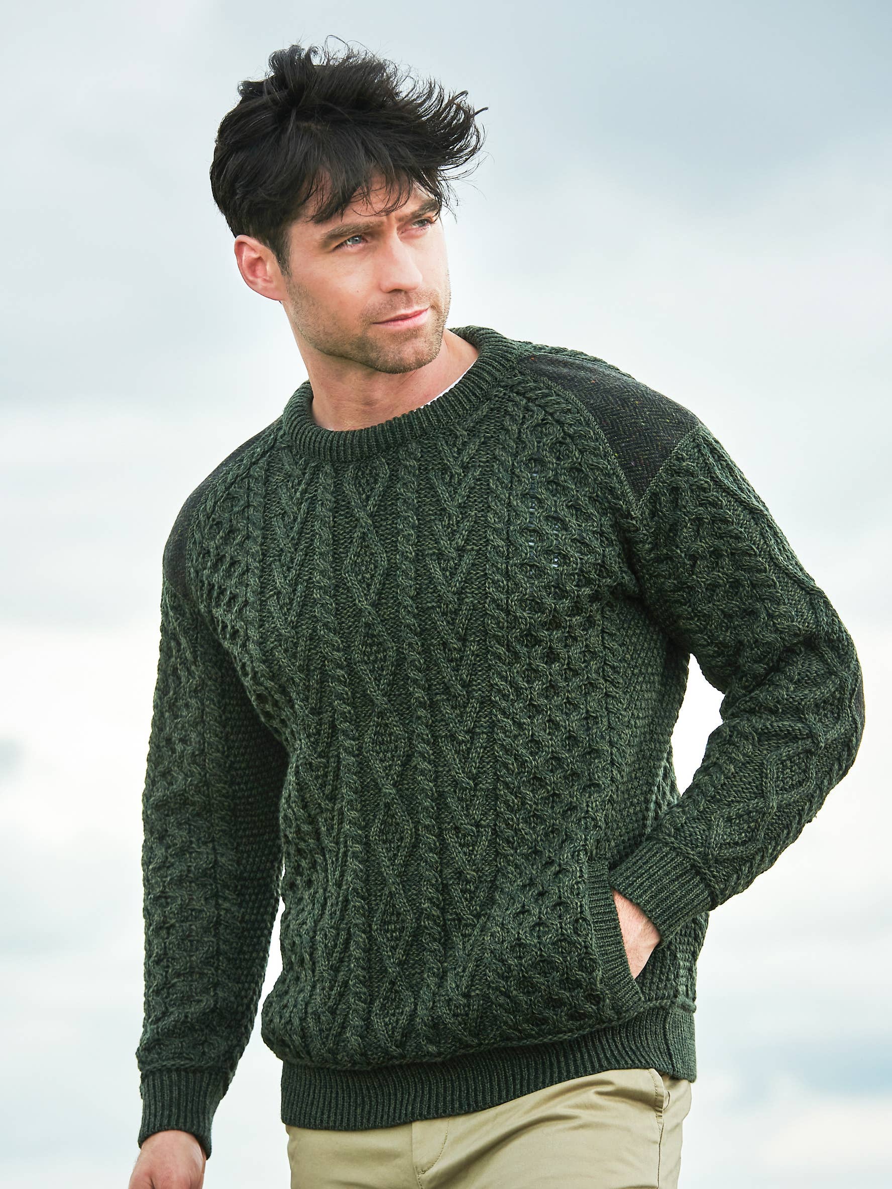 Hecho con 100 % pura lana. Este suéter de lana con cuello redondo y punto tradicional de pescador se teje con un patrón de costura de canalé grande, lo que lo hace excepcionalmente cálido. Tradicionalmente usado por pescadores en mar abierto.